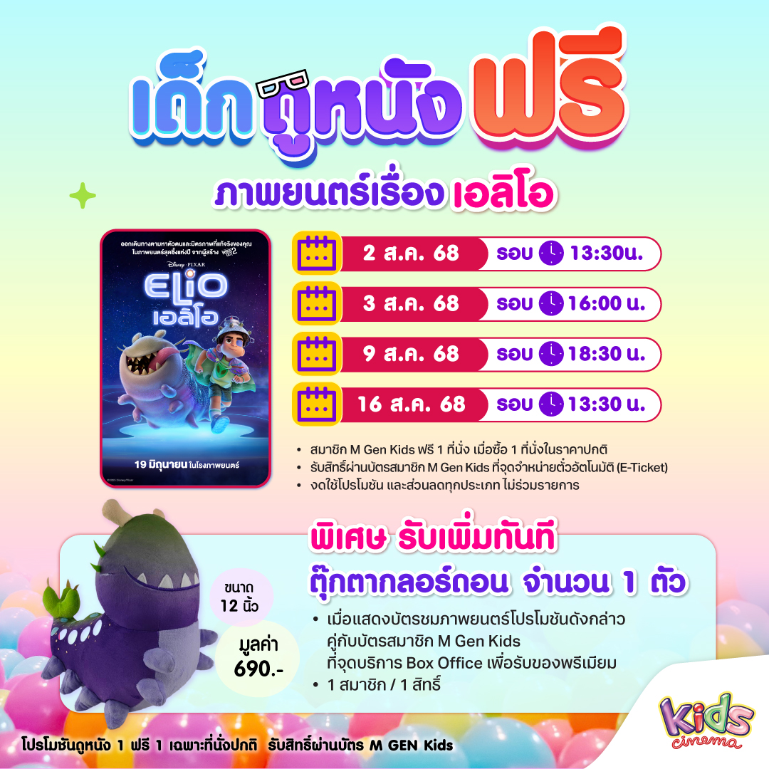 - สำหรับภาพยนตร์เรื่อง เอลิโอ รับทันที ตุ๊กตากลอร์ดอน จำนวน 1 ตัว ขนาด 14 นิ้ว มูลค่า 690.- เมื่อแสดงบัตรชมภาพยนตร์โปรโมชันดังกล่าว คู่กับบัตรสมาชิก M Gen Kids ที่จุดบริการ Box Office เพื่อรับของพรีเมียม