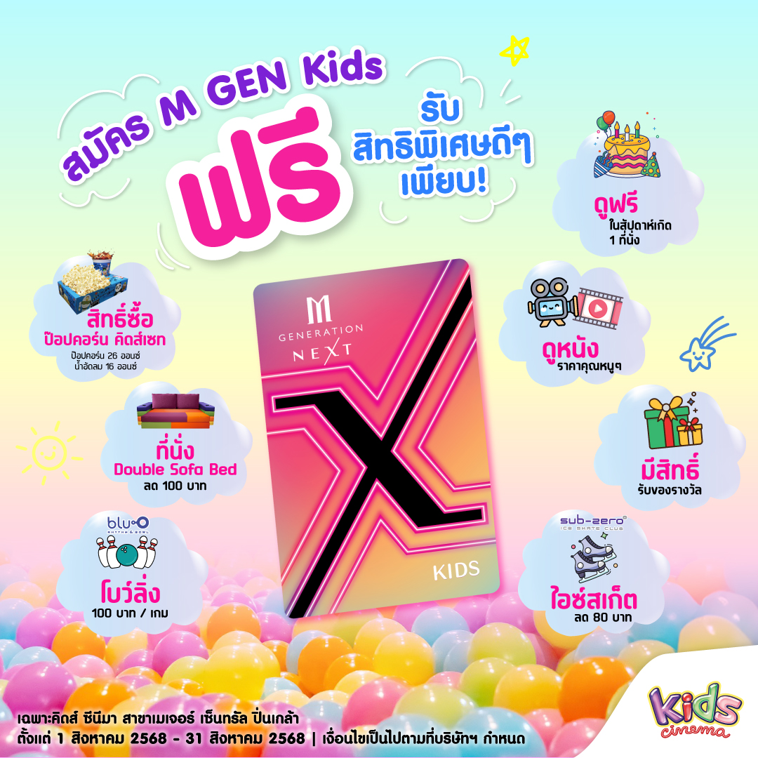 สมัครบัตรสมาชิก M GEN Kids ฟรีตลอดเดือนสิงหาคม สำหรับเด็กอายุไม่เกิน 12 ปีบริบูรณ์ เพื่อรับสิทธิพิเศษมากมายสำหรับการชมภาพยนตร์และสิทธิประโยชน์อื่น ๆ เช่นสิทธิ์ดูภาพยนตร์ฟรี 1 ที่นั่งในสัปดาห์วันเกิด, บัตรชมภาพยนตร์ ราคาเริ่มต้นเพียง 120 บาท, รับส่วนลด 100 บาท สำหรับที่นั่งประเภท Double Sofa Bed (ที่นั่งสำหรับครอบครัว), สิทธิ์ซื้อชุดป๊อปคอร์น Kid Set ในราคาเพียง 50 บาท และสิทธิ์รับของรางวัลมากมาย