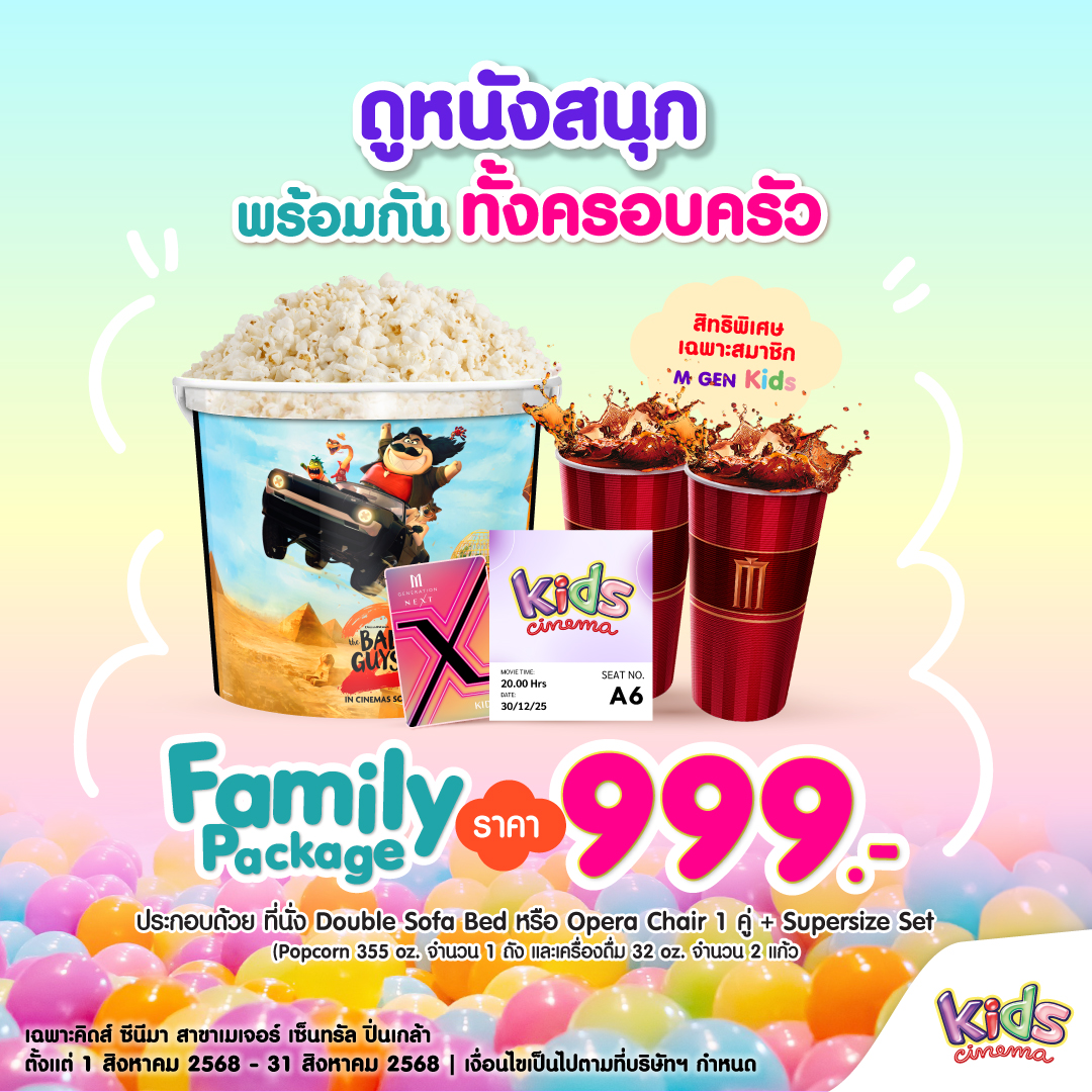 - สมาชิก M GEN Kids รับสิทธิ์ซื้อ Family Package (ที่นั่ง Double Sofa Bed หรือ Opera Chair (อย่างใดอย่างหนึ่ง) และ Supersize Set ประกอบด้วย Popcorn ขนาด 355 ออนซ์ จำ นวน 1 ถัง และ น้ำ อัดลม ขนาด 32 ออนซ์ จำ นวน 2 แก้ว