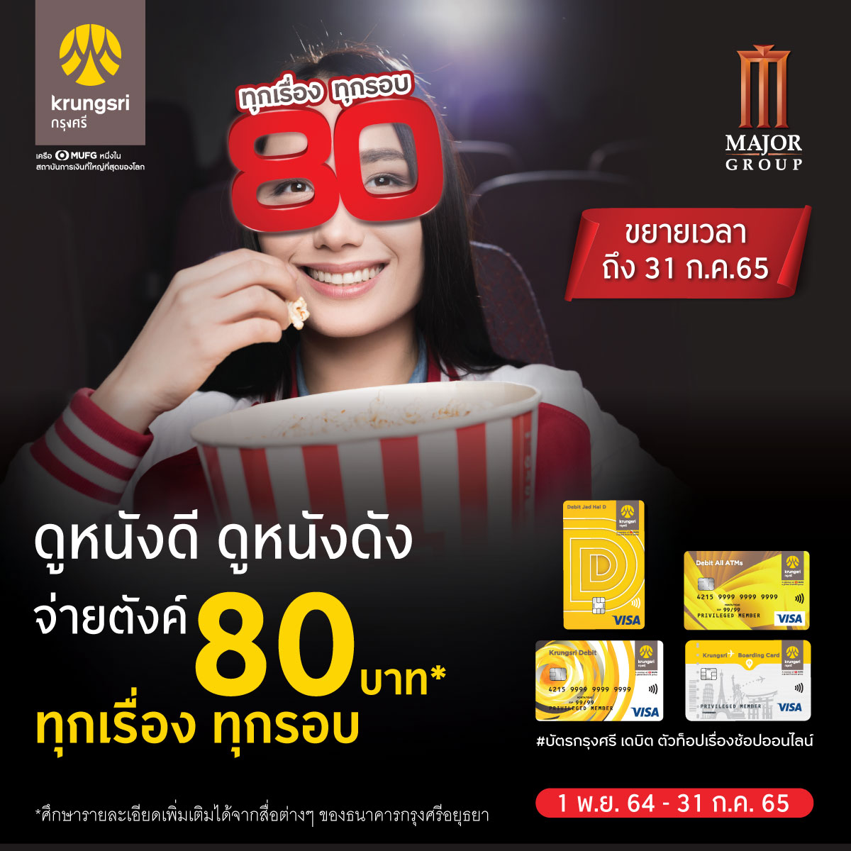 โปรโมชั่นพิเศษสำหรับลูกค้าบัตรกรุงศรี เดบิต ทุกประเภท และ Krungsri Boarding Card ซื้อบัตรชมภาพยนตร์เครือเมเจอร์ซีนีเพล็กซ์กรุ้ป ราคา 80 บาท ทุกเรื่อง ทุกรอบ