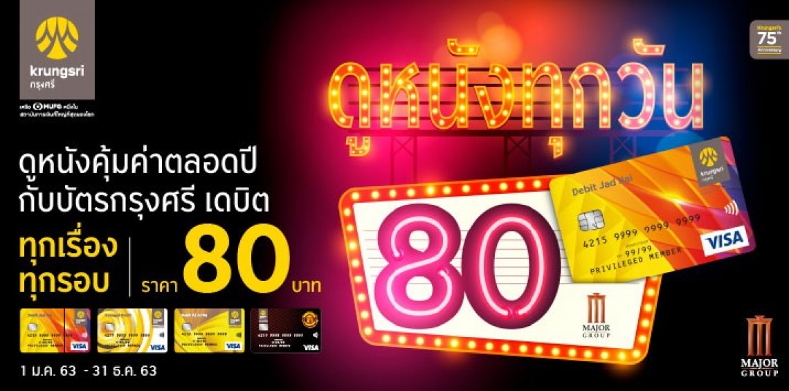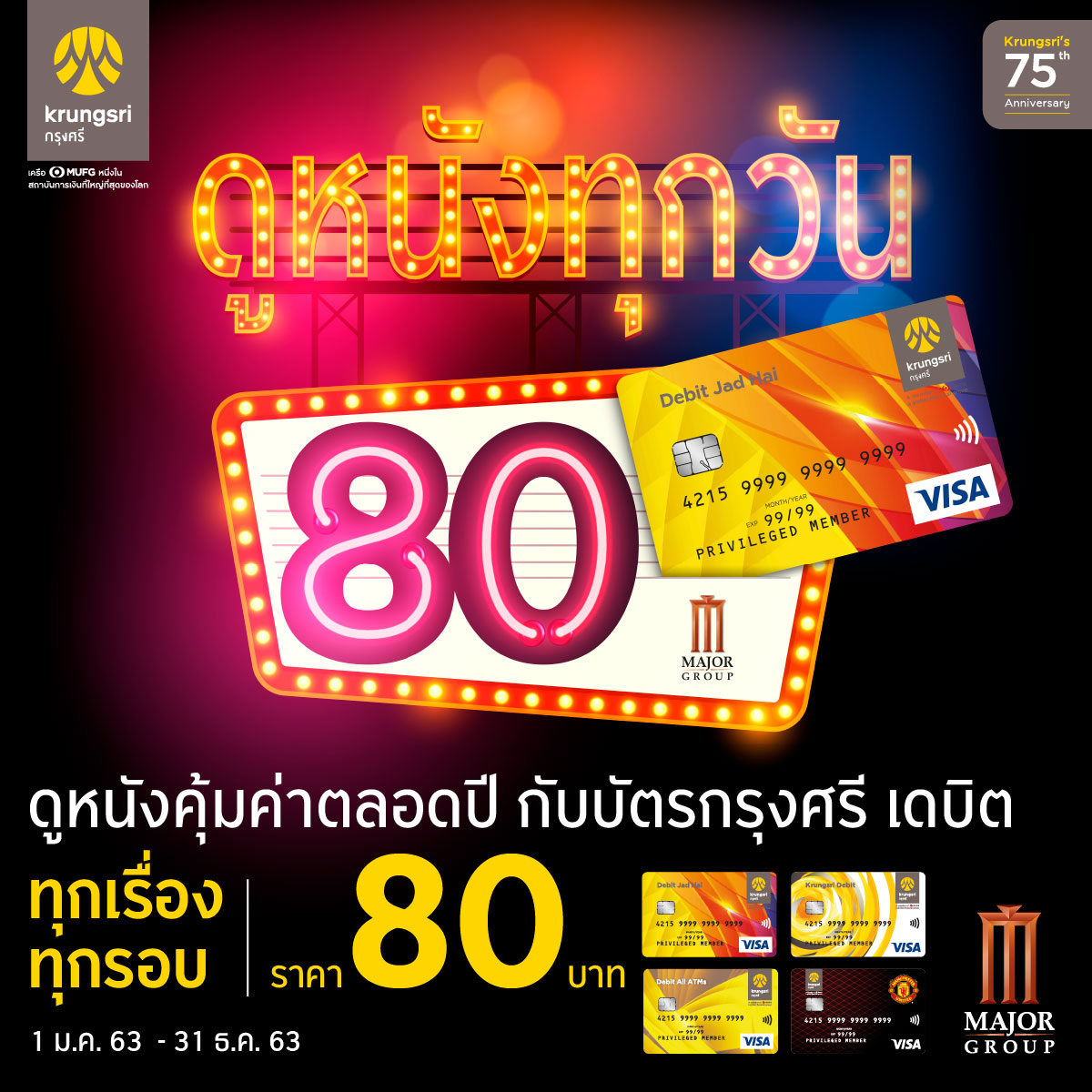 โปรโมชั่นพิเศษสำหรับลูกค้าบัตรกรุงศรี เดบิต และ Krungsri Boarding Card ซื้อบัตรชมภาพยนตร์ เครือเมเจอร์ ซีนีเพล็กซ์ กรุ้ป ราคา 80 บาท ทุกเรื่องทุกรอบ(จำกัดเดือนละ 5,000 สิทธิ์) รวม 60,000 สิทธิ์