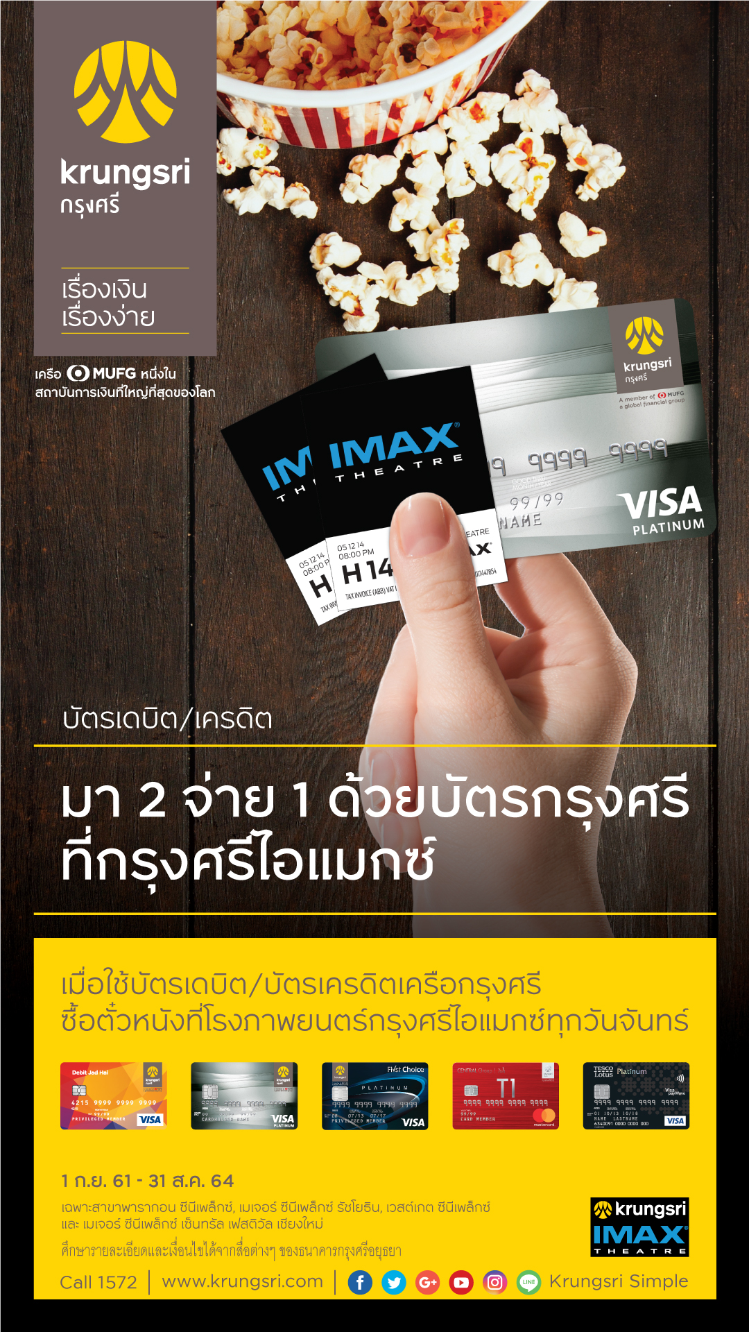 • สิทธิพิเศษสำหรับผู้ถือบัตรเครดิต หรือ บัตรเดบิต กรุงศรี ทุกประเภท ที่รูดซื้อบัตรชมภาพยนตร์ ณ เคาน์เตอร์ Box Office โรงภาพยนตร์เท่านั้น