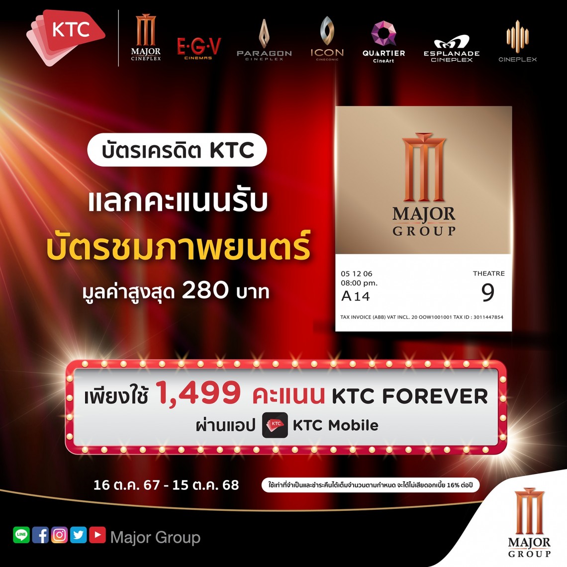 พิเศษสำหรับสมาชิกบัตรเครดิต KTC ใช้ 1,499 คะแนน KTC FOREVER แลกรับบัตรชมภาพยนตร์ 1 ที่นั่ง(ที่นั่งปกติ) รับสิทธิ์ผ่าน Application KTC Mobile (KTC เป็นผู้กำหนดสิทธิ์เอง)