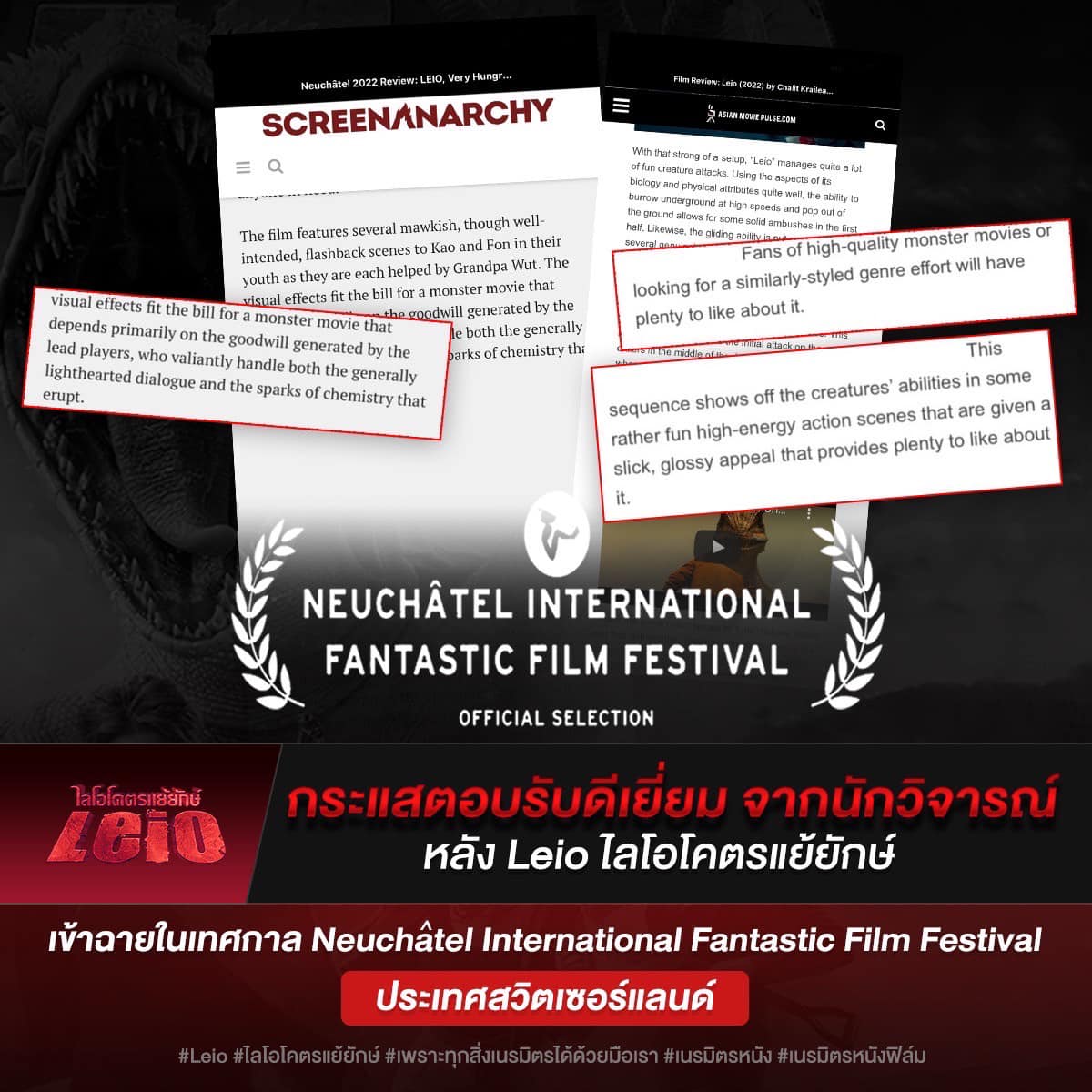 หลังจากที่ LEIO ไลโอโคตรแย้ยักษ์ ได้เข้าฉายที่เทศกาล Neuchatel International Fantastic Film Festival ที่ประเทศ สวิตเซอร์แลนด์ ก็ได้รับเสียงชื่นชมจากนักวิจารณ์ต่างประเทศอย่างล้นหลาม และนี่คือคำวิจารณ์เพียงบางส่วนเท่านั้น