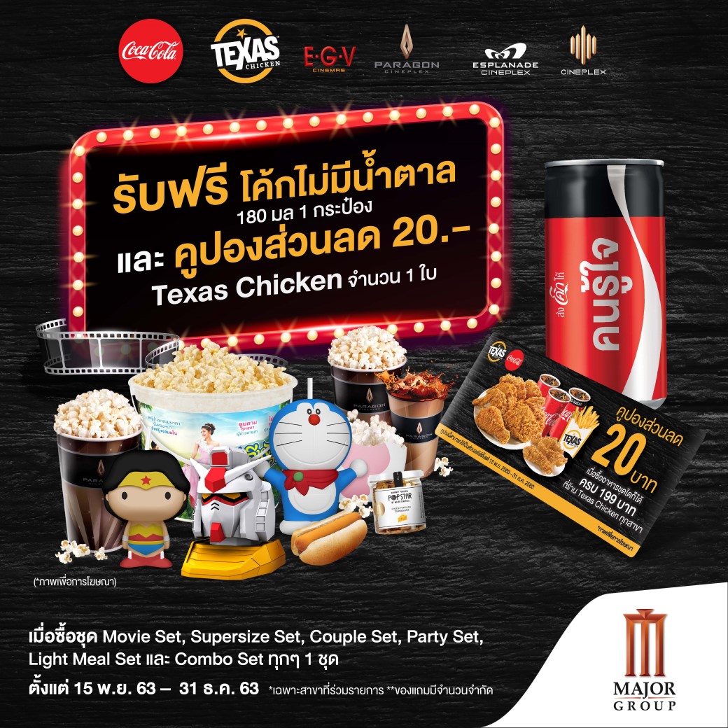 รับฟรีคูปองเท็กซัส ชิคเก้น ส่วนลด 20 บาท 1 ใบ และ โค้ก ไม่มีน้ำตาล 180 มล. 1 กระป๋อง (ของแถมมีจำนวนจำกัด)