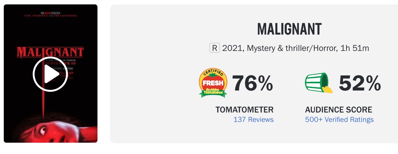 เว็บไซต์ rottentomatoes.com/ เผยคะแนนวิจารณ์ของหนังเรื่อง MALIGNANT ผลงานภาพยนตร์สยองเรื่องล่าสุดของเจมส์ วาน ซึ่งได้คะแนน 76% และได้การันตีความสดสยอง โดยนักรีวิวส่วนใหญ่ชื่นชมเจมส์ วาน ที่สามารถสร้างบรรยากาศความหลอนสะกดคนดูได้ทั้งโรงหนัง และเนื้อเรื่องน่าติดตาม คลายปมให้คนดูได้เข้าใกล้ตัวละครไปได้ตลอดทั้งเรื่อง นอกจากนี้มันยังมีพื้นเรื่องที่หนักแน่นเพียงพอที่จะสามารถแยกออกมาเป็นอีกเฟรนไชนส์หนังของเจมส์ วาน ตามรอย Insidious และ Conjuring ได้เลย