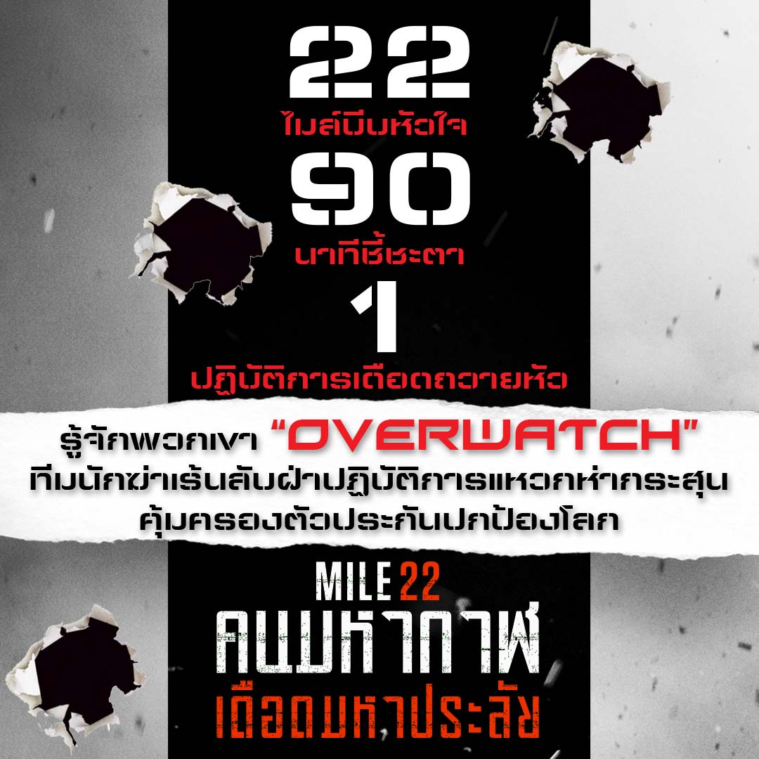 ถ้ายังไม่รู้จักพวกเขาดีพอ..อย่าคิดสู้กับพวกเขา! เปิดปฏิบัติการโคตรโหด มันส์ เดือดที่สุด ไปกับทีม “โอเวอร์วอทช์” จากภาพยนตร์แอคชั่นแห่งปี 2018 “Mile 22 คนมหากาฬ เดือดมหาประลัย” ปฏิบัติการลับระดับโลก เมื่อพวกเขาต้องรวมทีมเพื่อคุ้มกันเจ้าหน้าที่ตำรวจผู้กุมความลับที่ซ่อนสารกัมมันตรังสีที่สูญหายไป ทุกคนมีเวลาเพียง 90 นาทีชี้ชะตาชีวิต เป้าหมายเดียวคือ ฝ่าดงกระสุนเพื่อส่งเขาไปให้ถึงสนามบินที่อยู่ห่างออกไป 22 ไมล์ให้สำเร็จ ซึ่งภารกิจสำคัญครั้งนี้ต้องยกหน้าที่ให้ทีม “โอเวอร์วอทช์” เท่านั้น เพราะนี่คือปฏิบัติการที่โหดที่สุด ต้องการคนที่ระห่ำที่สุด!