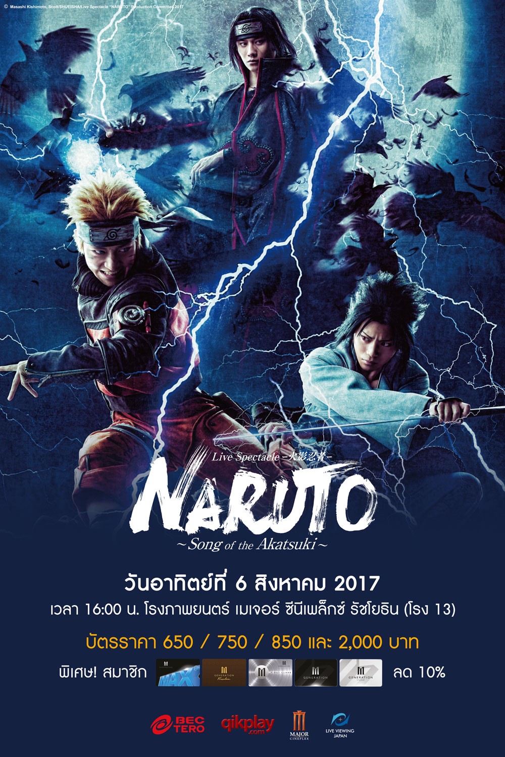 สำหรับ Live Spectacle NARUTO -Song of the Akatsuki- Live Viewing เปิดให้แฟนนารูโตะได้รับชมพร้อมกันที่โรงภาพยนตร์เมเจอร์ ซีนีเพล็กซ์ สาขารัชโยธิน โรง 13 ในวันอาทิตย์ที่ 6 สิงหาคม 2017 เวลา16:00น.