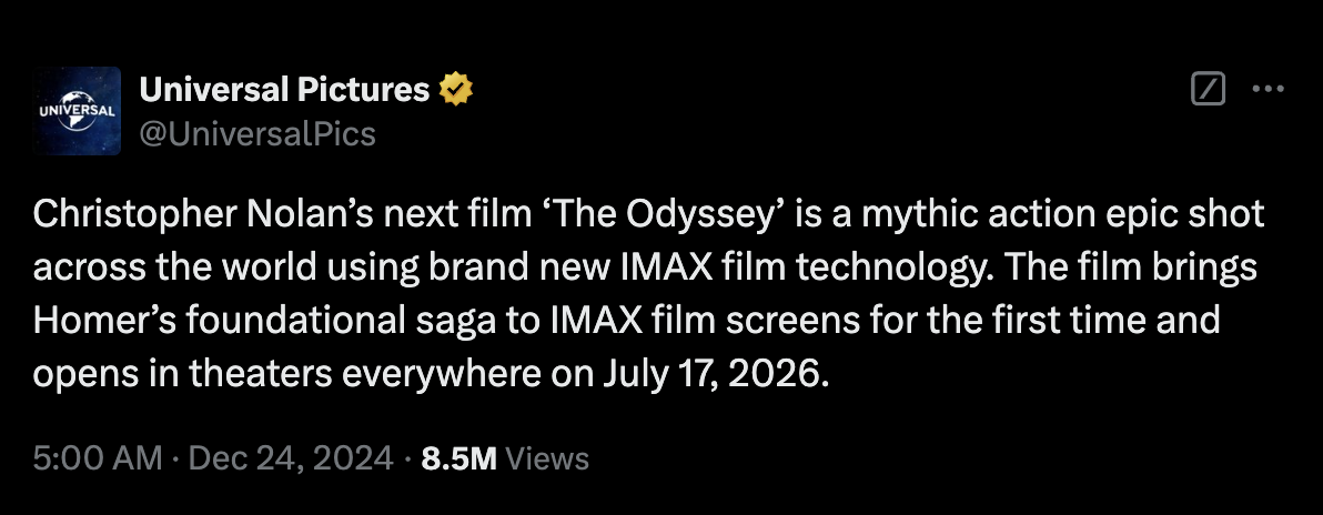 “ภาพยนตร์เรื่องต่อไปของ คริสโตเฟอร์ โนแลน ที่มีชื่อว่า The Odyssey จะเป็นภาพยนตร์แอ็กชันมหากาพย์เกี่ยวกับตำนานปรัมปรา ที่ถ่ายทำในสถานที่ต่าง ๆ ทั่วโลกด้วยการใช้เทคโนโลยีใหม่ล่าสุดของฟิล์มไอแมกซ์”