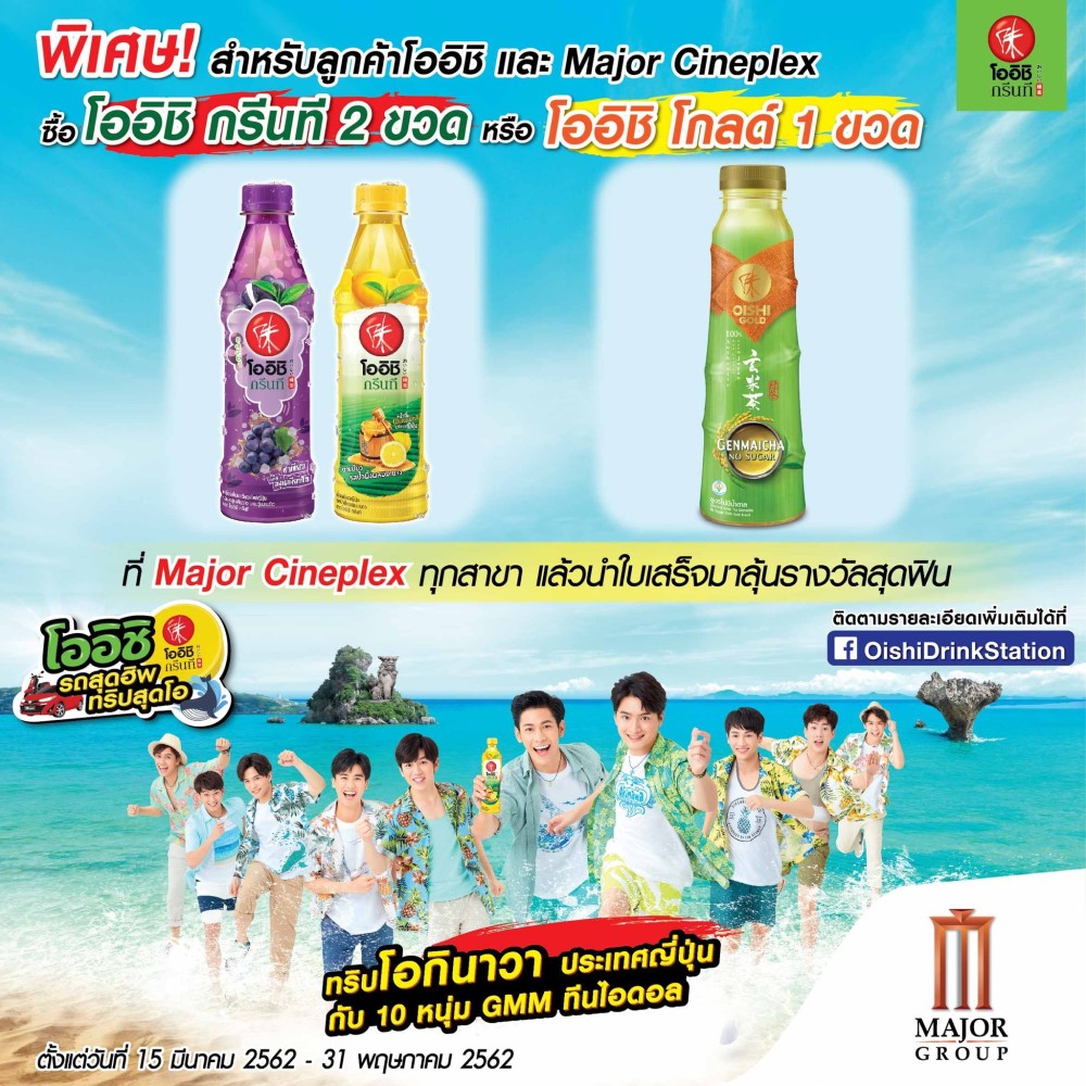 - ผู้ร่วมรายการซื้อโออิชิ กรีน ที ทุกรสชาติ, โออิชิ แบล็คที, หรือ จับใจ ทุกขนาด (เฉพาะขวดพลาสติก) จำนวน 2 ขวด หรือ ซื้อโออิชิ โกลด์ จำนวน 1 ขวด ต่อ 1 ใบเสร็จ ที่โรงภาพยนตร์ในเครือเมเจอร์ กรุ้ป ทุกสาขา