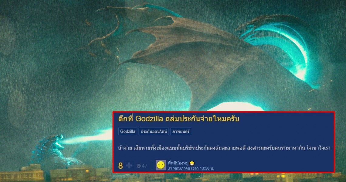 ล่าสุดได้เกิดกระแสบนโลกออนไลน์ เมื่อ สมาชิกเว็บไซต์พันทิป พี่หมีน้องหมู ได้เปิดกระทู้ตั้งคำถามเกี่ยวกับภาพยนตร์เรื่อง godzilla king of the monsters โดยมีการถามว่า ตึกที่Godzilla ในหนังนั้นบริษัทประกันต้องรับผิดชอบค่าใช้จ่ายหรือไม่ ? โดยเจ้าของกระทู้ได้แสดงความเห็นใจว่าถ้าบริษัทประกันต้องรับผิดชอบก็น่าสงสารเพราะตึกโดนถล่มทั้งเมือง บริษัทอาจจะล้มละลายได้