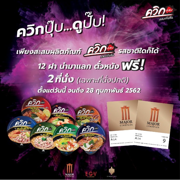 คุณสมบัติ : ลูกค้าซื้อผลิตภัณฑ์ควิกแสบ รสชาติใดก็ได้ สะสมฝา จำนวน 12 ฝา นำมาแลกรับบัตรชมภาพยนตร์ฟรี 2 ที่นั่ง รับสิทธิ์ได้ที่ บูธ M-Generation เพื่อรับ SlipBarcode สำหรับใช้ที่ตู้ E-Ticket