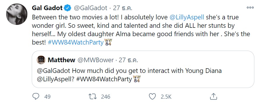 ล่าสุด กัล กาโดท์ ก็ได้ออกมาเปิดเผยผ่านทวิตเตอร์ส่วนตัวของตัวเอง เมื่อมีแฟนหนังไปทวิตสอบถามว่า เธอได้มีปฏิสัมพันธ์อะไรกับน้องนักแสดงที่แสดงเป็นไดอาน่าวัยเด็กบ้าง กัลก็ได้มาตอบคำถามนี้พร้อมเปิดเผยความจริงเบื้องหลังที่น่าทึ่ง