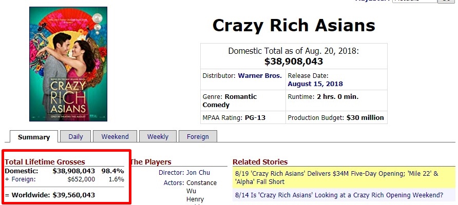 Crazy Rich Asians สามารถประสบความสำเร็จทั้งในแง่คำวิจารณ์ และรายได้จากฝั่งฮอลลีวูด โดยทำรายได้เปิดตัวในอเมริกาสูงที่สุดเป็นอันดับหนึ่ง กวาดไปแล้วกว่า $38 ล้าน และได้รับการการันตีมะเขือสดที่ 93% พร้อมคะแนน 7.7/10 จากนักวิจารณ์ 160 คนของเว็บไซต์ Rottentomatoes เป็นเครื่องยืนยันแล้วว่าภาพยนตร์เรื่องนี้มีดีกว่าที่คาด ในขณะที่ชาวตะวันตกซึ่งอาจไม่คุ้นเคยกับภาพยนตร์ที่มีเนื้อเรื่องลักษณะนี้ยังชื่นชอบ ชาวเอเชียอย่างเรา ๆ ที่คุ้นเคยกันดีอยู่แล้วยิ่งการันตีได้เลยว่าจะต้องหลงรักภาพยนตร์เรื่องนี้อย่างแน่นอน