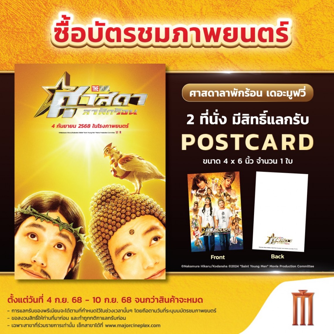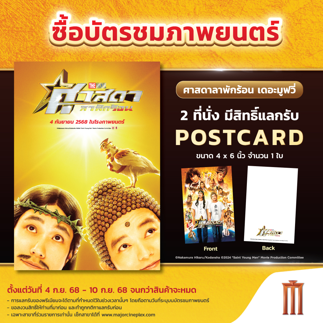 • ซื้อบัตรชมภาพยนตร์ “ศาสดาลาพักร้อน” ทุก 2 ที่นั่ง มีสิทธิ์แลกรับโปสการ์ด 1 ใบ (ขนาด 4x6 นิ้ว)
