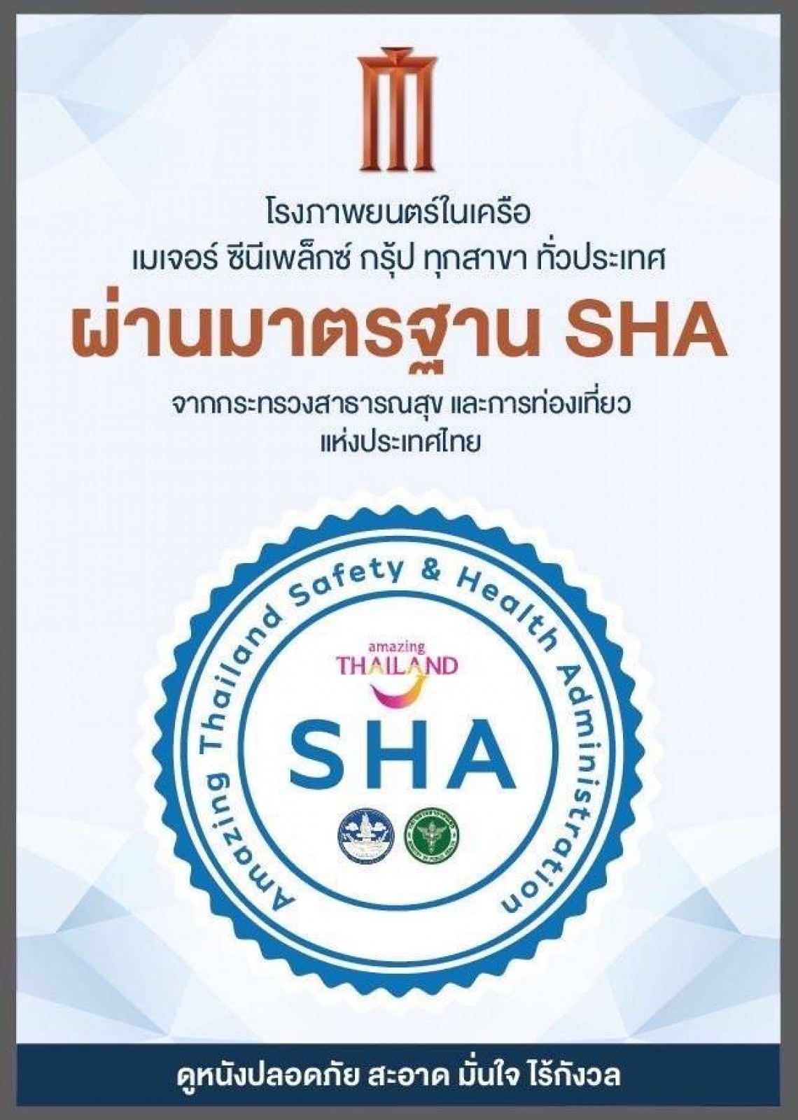 เพราะเราห่วงใยอยากให้คุณได้มีความสุขกับภาพยนตร์เรื่องโปรดอย่างสบายใจและอุ่นใจ ทุกครั้งที่มาใช้บริการที่โรงภาพยนตร์ในเครือ เมเจอร์ ซีนีเพล็กซ์ กรุ้ป ใกล้บ้านคุณ ทั้ง 166 สาขา ทั่วประเทศ ภายใต้มาตรฐาน SHA ทำให้มั่นใจได้ว่าทางโรงภาพยนตร์ของเราเห็นความสำคัญต่อ ความปลอดภัยของลูกค้าทุกท่าน อย่างจริงใจ #MajorGroup #SHA #MajorCineplex #ดูหนังปลอดภัยสะอาดมั่นใจไร้กังวล