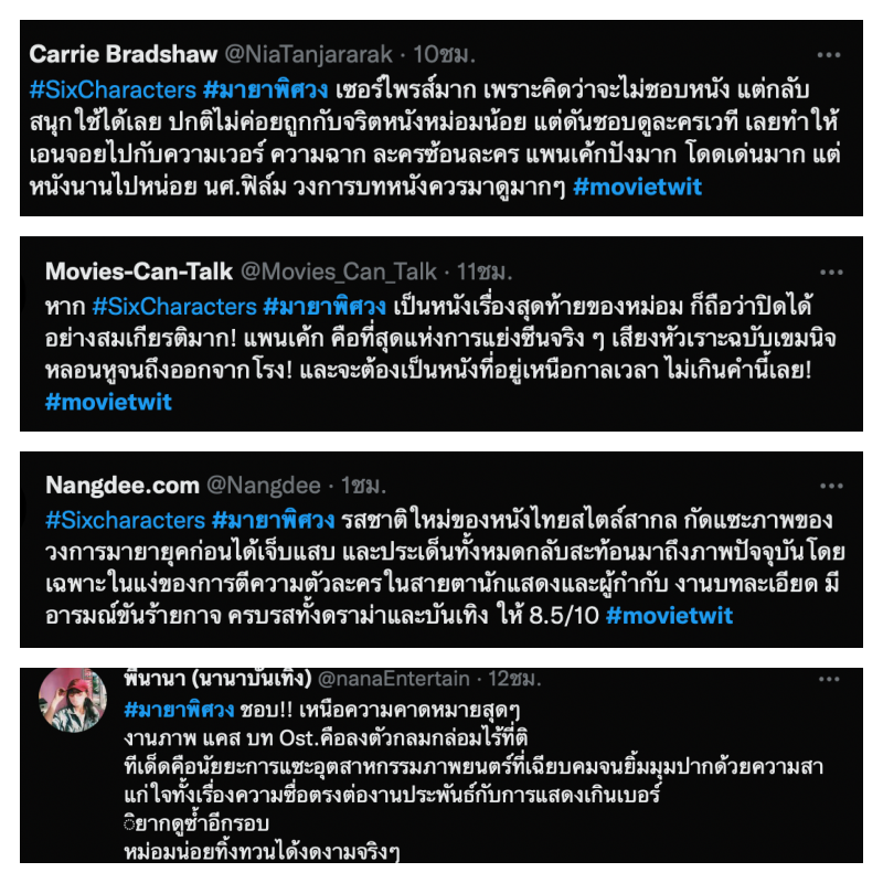 นอกจากนี้ งาน World Premiere ยังเชิญนักรีวิวนักวิจารณ์ชื่อดังจากเพจดังต่างๆมากมายมาร่วมค้นหาความสวยงามในภาพยนตร์ Six Characters มายาพิศวง ไปด้วยกัน เราไปพบกับความคิดเห็นของพวกเขาเหล่านั้นกันดีกว่า