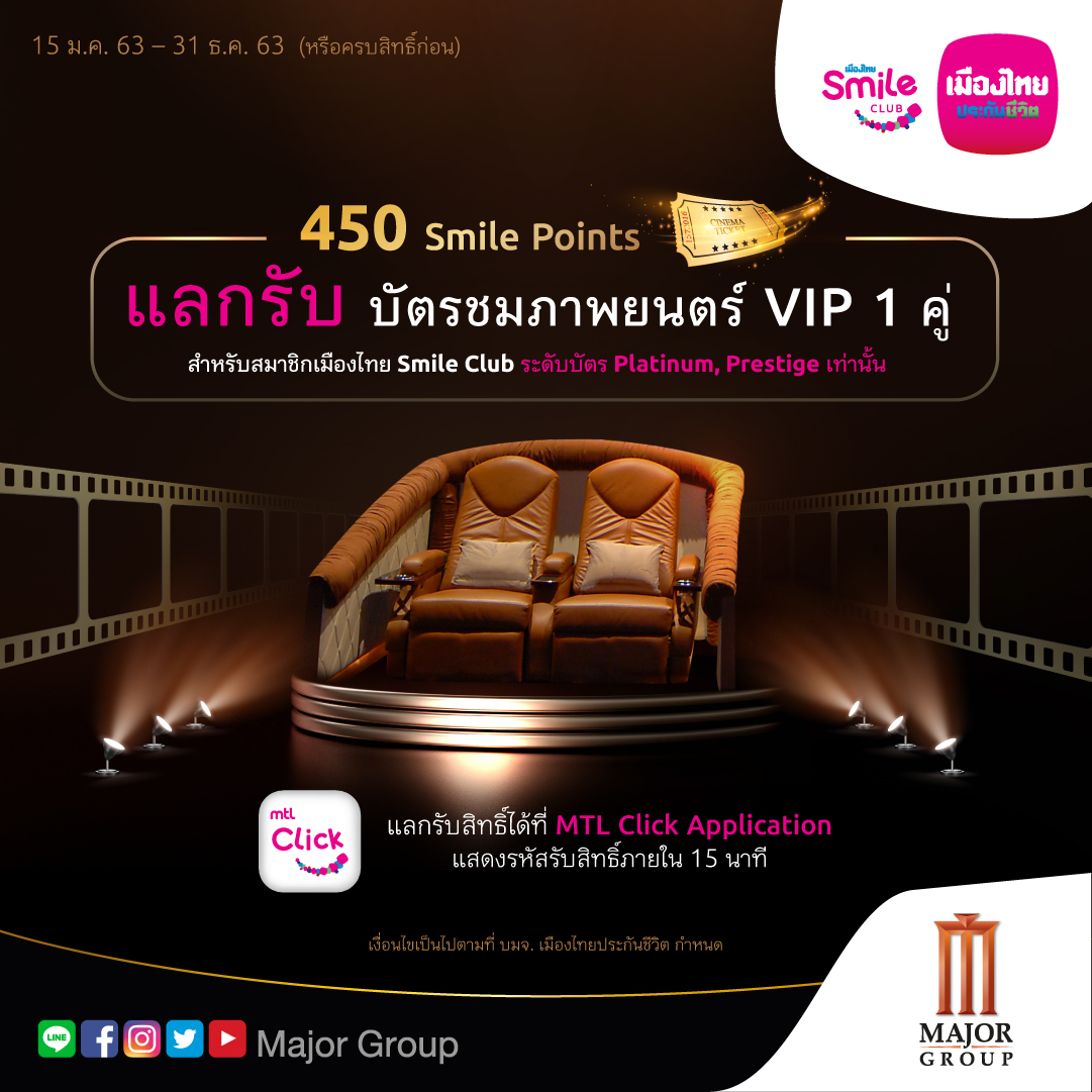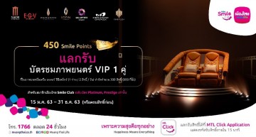คุณสมบัติ : สมาชิกเมืองไทย Smile Club ระดับบัตร Platinum, Prestige เท่านั้น Smile Point 450 คะแนน แลกรับบัตรชมภาพยนตร์ VIP 1 คู่ (2 ที่นั่ง)