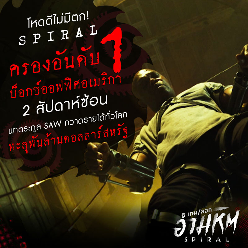 โหดดีไม่มีตก! “Spiral: From the Book of Saw เกมลอกอำมหิต” ทำสถิติใหม่ครองแชมป์บ็อกซ์ออฟฟิศอเมริกา 2 สัปดาห์ซ้อนเป็นครั้งแรกในแฟรนไชส์! หลังจากที่เข้าฉายไปเมื่อวันที่ 14 พฤษภาคมที่ผ่านมา แน่นอนว่าความปังยังไม่จบแค่นั้น ยังสร้างตำนานครั้งใหญ่ ด้วยการพาตระกูล Saw กวาดรายได้ทั่วโลกทะลุพันล้านดอลลาร์สหรัฐ เป็นที่เรียบร้อยแล้ว!