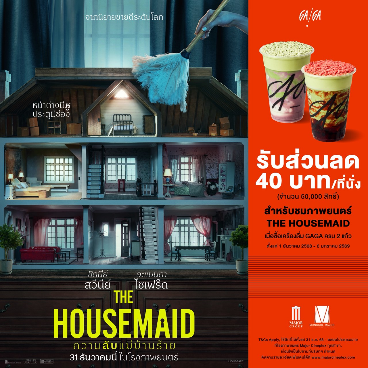 • ซื้อเครื่องดื่ม GAGA เมนูใดก็ได้ ไซซ์ใดก็ได้ ครบ 2 แก้ว ที่หน้าร้านและเดลิเวอรี่ (ไม่รวมสาขาภายในสนามบิน) มีสิทธิ์รับส่วนลด 40 บาท สำหรับซื้อบัตรชมภาพยนตร์เรื่อง The House Maid จำนวน 1 สิทธิ์ ต่อ 1 ที่นั่ง