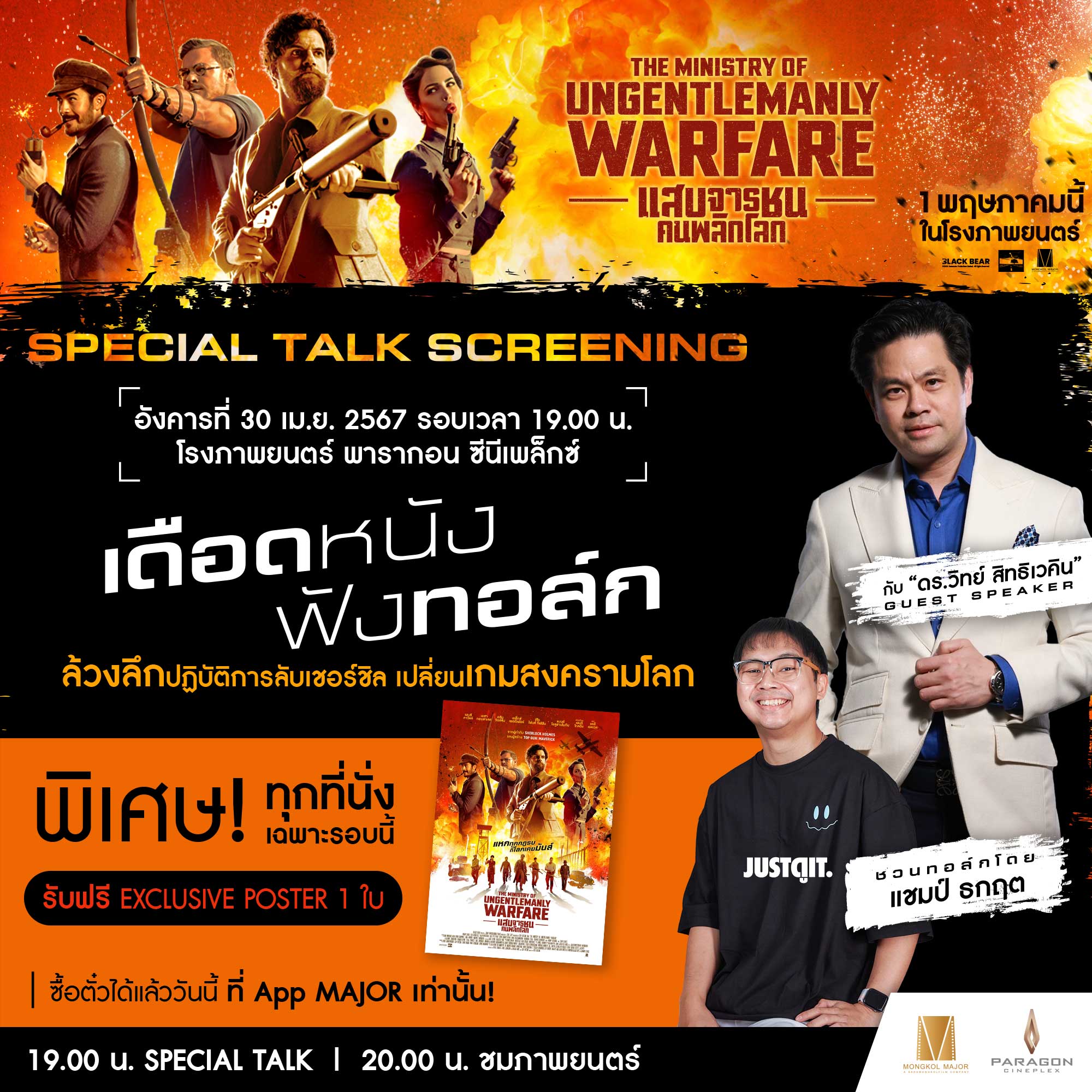 “มงคลเมเจอร์” พร้อมเปิดซัมเมอร์สุดระอุด้วยกิจกรรมทอล์กสนั่นมันส์คูณสอง “เดือดหนัง ฟังทอล์ก The Ministry of Ungentlemanly Warfare: ล้วงลึกปฏิบัติการลับเชอร์ชิล เปลี่ยนเกมสงครามโลก” กับสุดยอดกูรูประวัติศาสตร์โลกชื่อดัง “ดร.วิทย์ สิทธิเวคิน” (เฮียวิทย์) ร่วมเปิดวอร์ชวนทอล์กโดยยูทูบเบอร์สายหนังแถวหน้า “ธกฤต สมบัตินันท์” (แชมป์ JUST ดู IT.) ในประเด็นร้อนแรงกับวีรกรรมบันลือโลกของทีมโคตรจารชนโค่นทัพฮิตเลอร์ เพื่อให้คอหนังและผู้สนใจแง่มุมประวัติศาสตร์ได้ทั้งสาระและความบันเทิงอย่างเต็มอิ่ม พร้อมชมภาพยนตร์แอ็กชันสงครามโลกฟอร์มยักษ์ “The Ministry of Ungentlemanly Warfare แสบจารชนคนพลิกโลก” รอบพิเศษก่อนใครในวันอังคารที่ 30 เมษายนนี้ เวลา 19:00 น. ณ โรงภาพยนตร์สยามภาวลัย พารากอน ซีนีเพล็กซ์