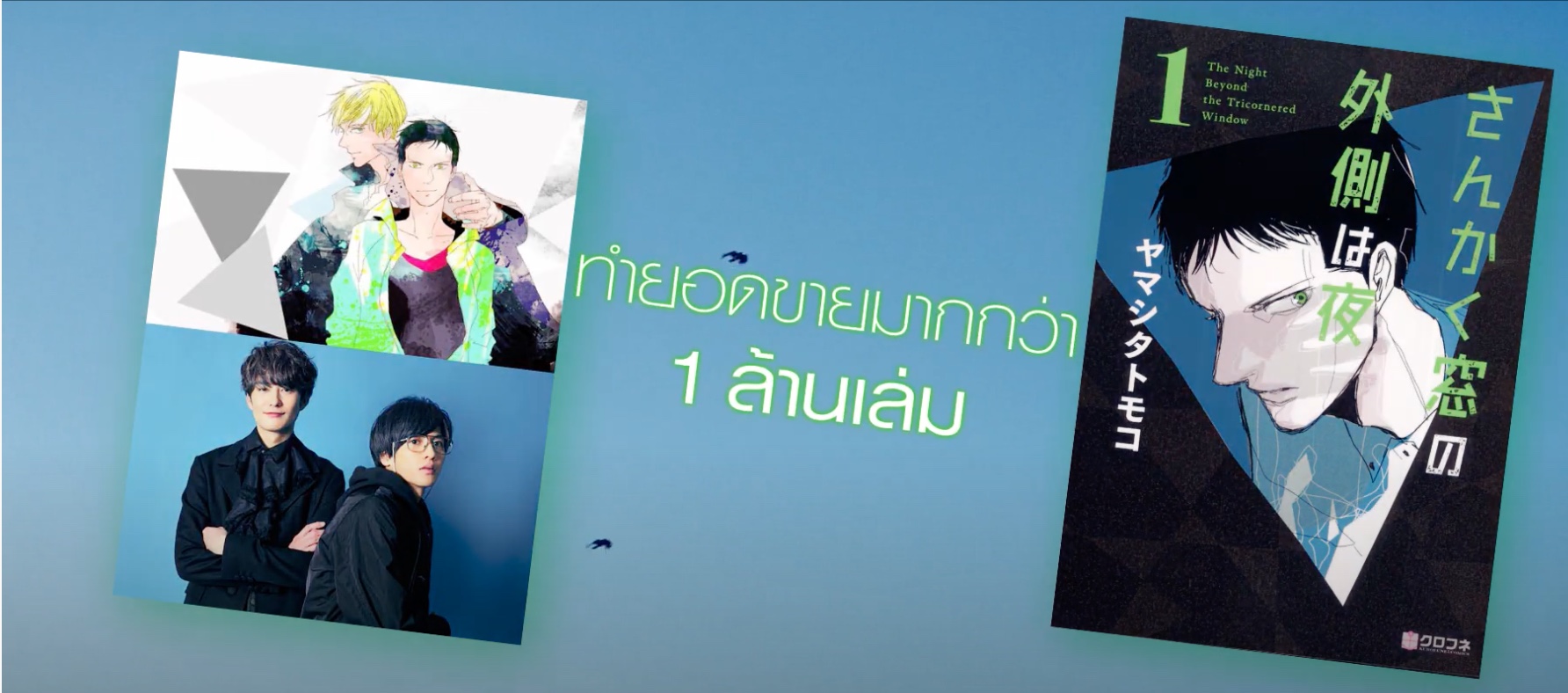 The Night Beyond the Tricornered Window ( さんかく窓の外側は夜 Sankaku Mado no Sotogawa wa our ) สร้างมาจากมังงะของ โทโมโกะ ยามาชิตะ ซึ่งได้รับการตีพิมพ์ตั้งแต่วันที่ 7 มีนาคม 2013 ถึง 7 ธันวาคม 2020 ในนิตยสารมังงะรายเดือน Magazine Be × Boy ซึ่งนำเสนอเนื้อหา การ์ตูนแนว Boy’s Love โดยเฉพาะ ภายหลังได้ตีพิมพ์แบบรวมเล่มออกมาอีกครั้ง จำนวน 10 เล่ม และได้รับการแปลเป็นภาษาอังกฤษ เพื่อจัดจำหน่ายในอเมริกาและประเทศอื่น ๆ อีกด้วย
