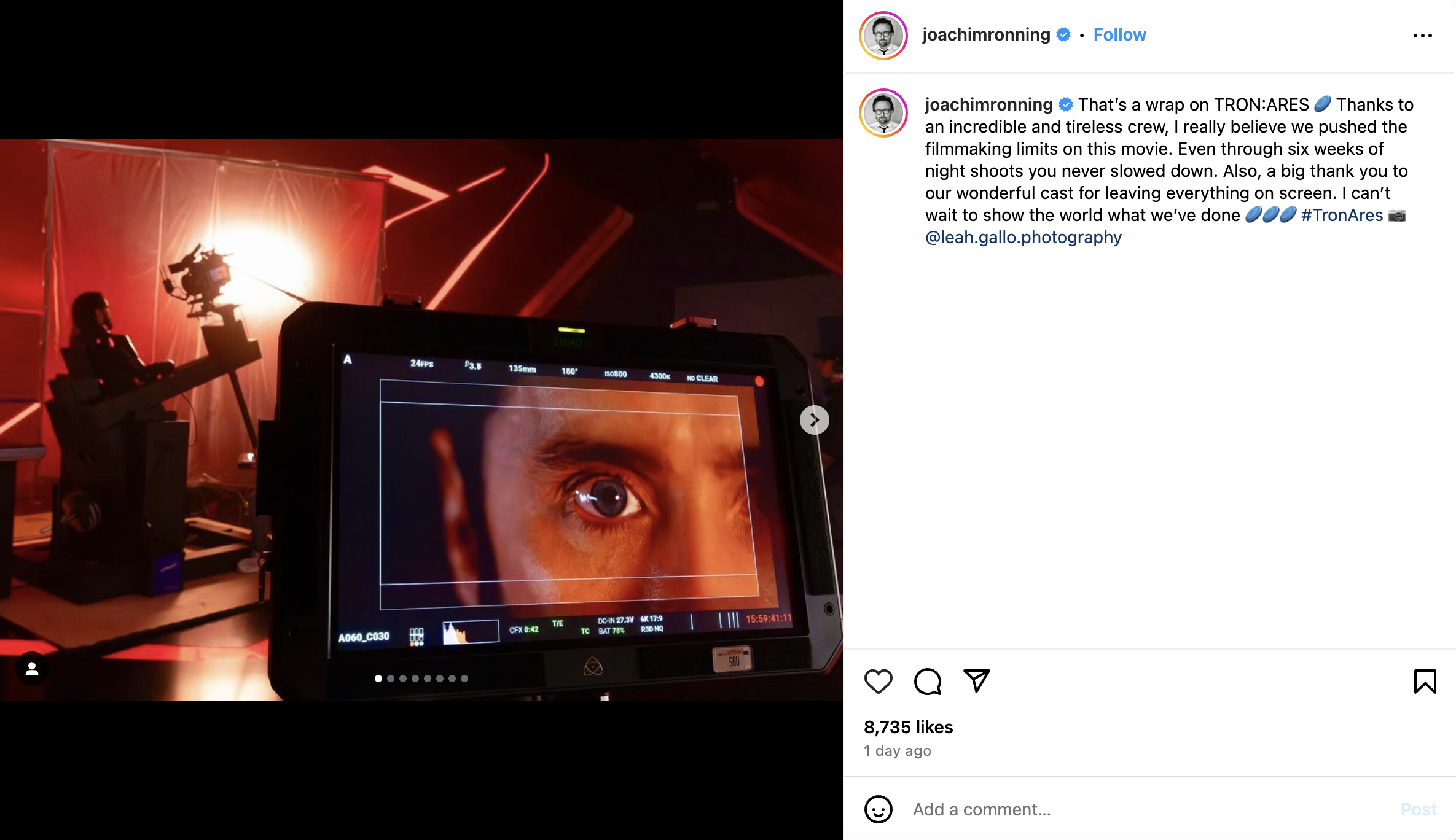 “และ TRON:ARES ก็ปิดกล้องถ่ายทำเป็นที่เรียบร้อยแล้ว ขอบคุณทีมงานแสนอัศจรรย์ที่ไม่รู้จักเหน็ดเหนื่อย ผมเชื่อว่าเราได้ผลักดันขีดจำกัดของการสร้างภาพยนตร์ในภาพยนตร์เรื่องนี้ แม้ว่าจะถ่ายทำตอนกลางคืนต่อเนื่องถึงหกสัปดาห์ แรงของพวกคุณก็ไม่ตกเลย นอกเหนือไปจากนั้น ก็ยังต้องขอบคุณทีมนักแสดงสุดมหัศจรรย์ที่ฝากผลงานเอาไว้บนหน้าจอ ผมรอไม่ไหวแล้วที่จะแสดงให้โลกได้เห็นถึงสิ่งที่เราได้ทำลงไป #TronAres”