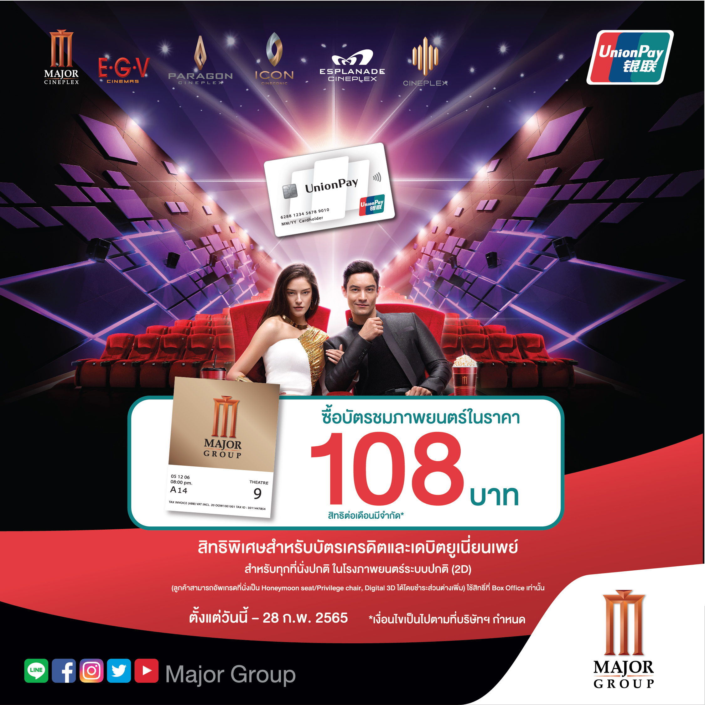Option 2 : ลูกค้าบัตรเดบิต Unionpay ซื้อบัตรชมภาพยนตร์ได้ในราคา108 บาท ณ โรงภาพยนตร์ในเครือเมเจอร์ ซีนีเพล็กซ์ และชำระเงินด้วยบัตรแดบิต Unionpay