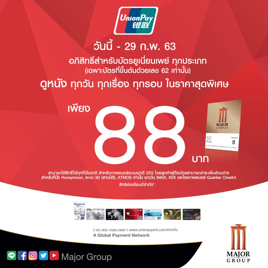 คุณสมบัติ : ลูกค้า Unionpay ซื้อบัตรชมภาพยนตร์ได้ในราคา 88 บาท ณ โรงภาพยนตร์ในเครือเมเจอร์ ซีนีเพล็กซ์ และชำระเงินด้วยบัตรเครดิต Unionpay ที่ขึ้นต้นด้วยหมายเลข 62XXXXXX XXXXXXXX