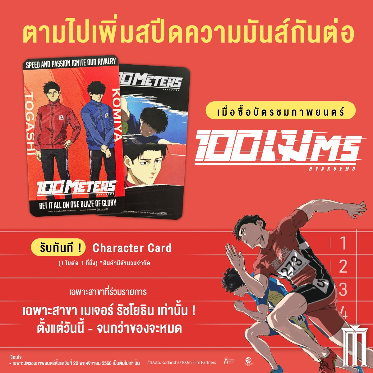 • เฉพาะลูกค้าที่ซื้อบัตรชมภาพยนตร์เรื่อง 100 Meters ทุกที่นั่ง รับ Character Card 1 ใบ