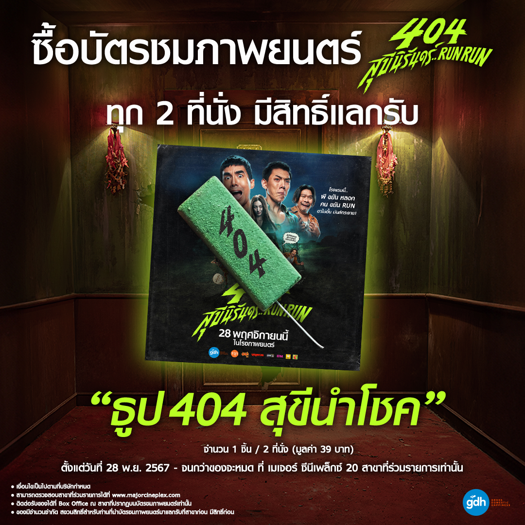• ซื้อบัตรชมภาพยนตร์ เรื่อง 404 สุขีนิรันดร์..Run Run ทุก 2 ที่นั่ง มีสิทธิ์แลกรับ “ธูป 404 สุขีนำโชค” 1 ชิ้น (มูลค่า 39 บาท)
