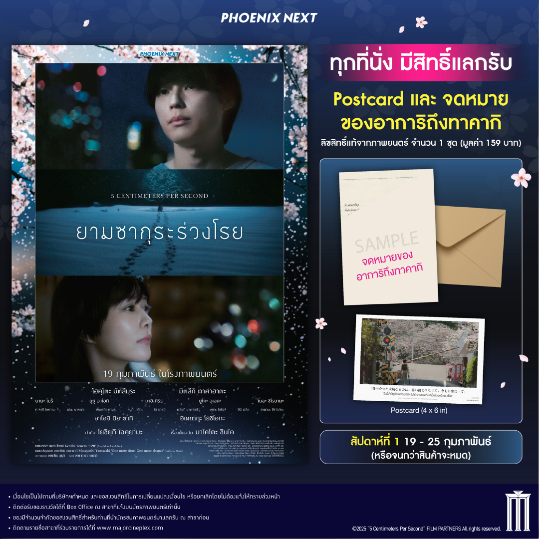 •  ซื้อบัตรชมภาพยนตร์ 5 Cm Per Second (Live Action) ทุกที่นั่ง มีสิทธิ์รับ โปสเตอร์และจดหมายของอาการิถึงทาคากิ จำนวน 1 ชุด มูลค่า 159 บาท