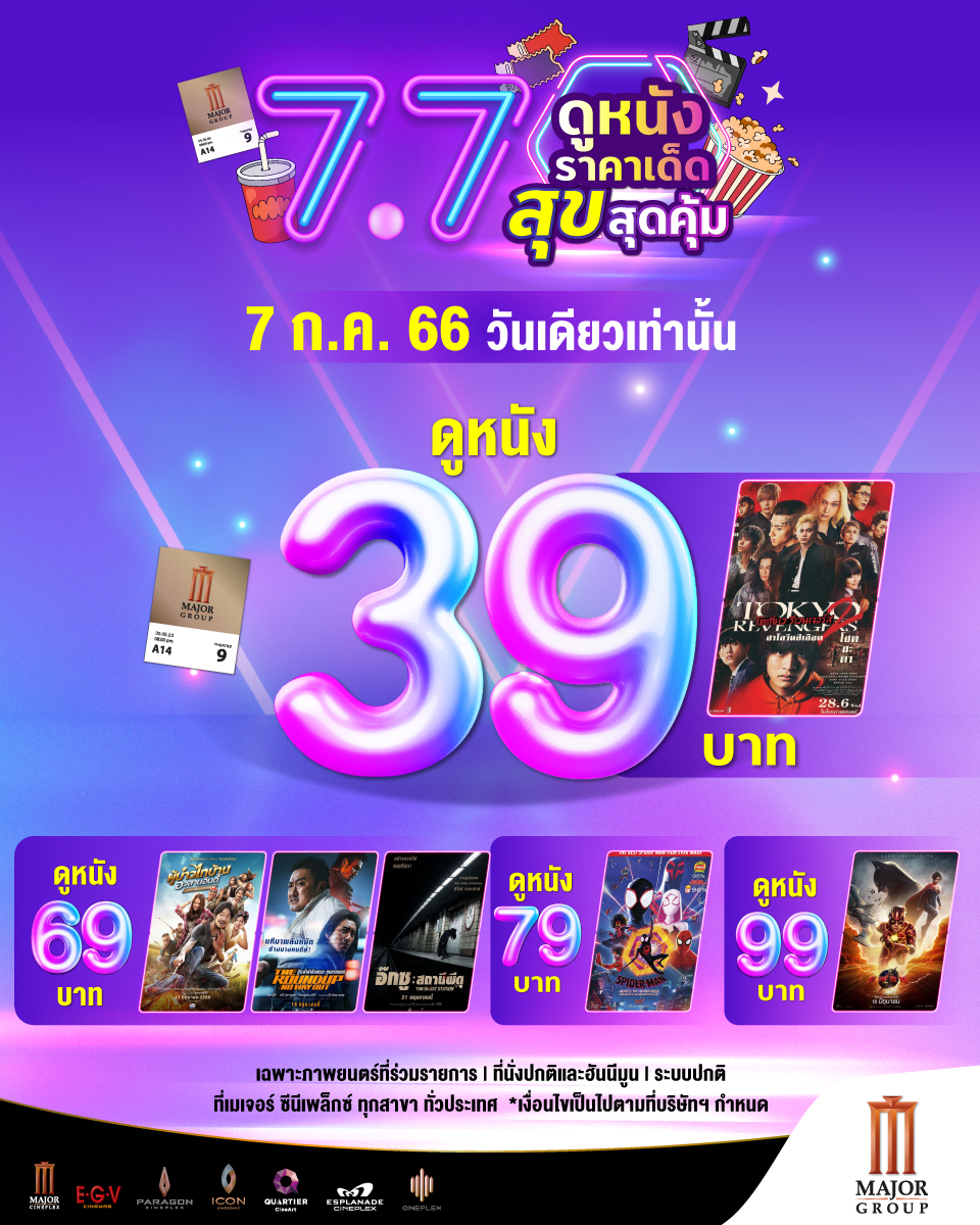 • ชมภาพยนตร์ราคาเริ่มต้น 39 บาท เฉพาะวันที่ 7 กรกฎาคม 2566 วันเดียวเท่านั้น เฉพาะภาพยนตร์ที่ร่วมรายการ ที่โรงภาพยนตร์เครือเมเจอร์ ซีนีเพล็กซ์ ทุกสาขาทั่วประเทศ