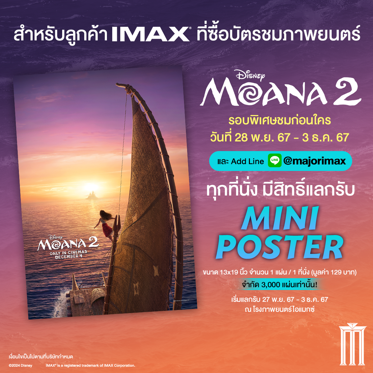 1. สำหรับลูกค้าที่ซื้อตั๋วชมภาพยนตร์ระบบ IMAX with Laser และ IMAX เรื่อง Moana 2 วันที่ 28 พ.ย. 67 – 3 ธ.ค. 67 พร้อมเพิ่มเพื่อน Line OA @majorimax มีสิทธิ์แลกรับ