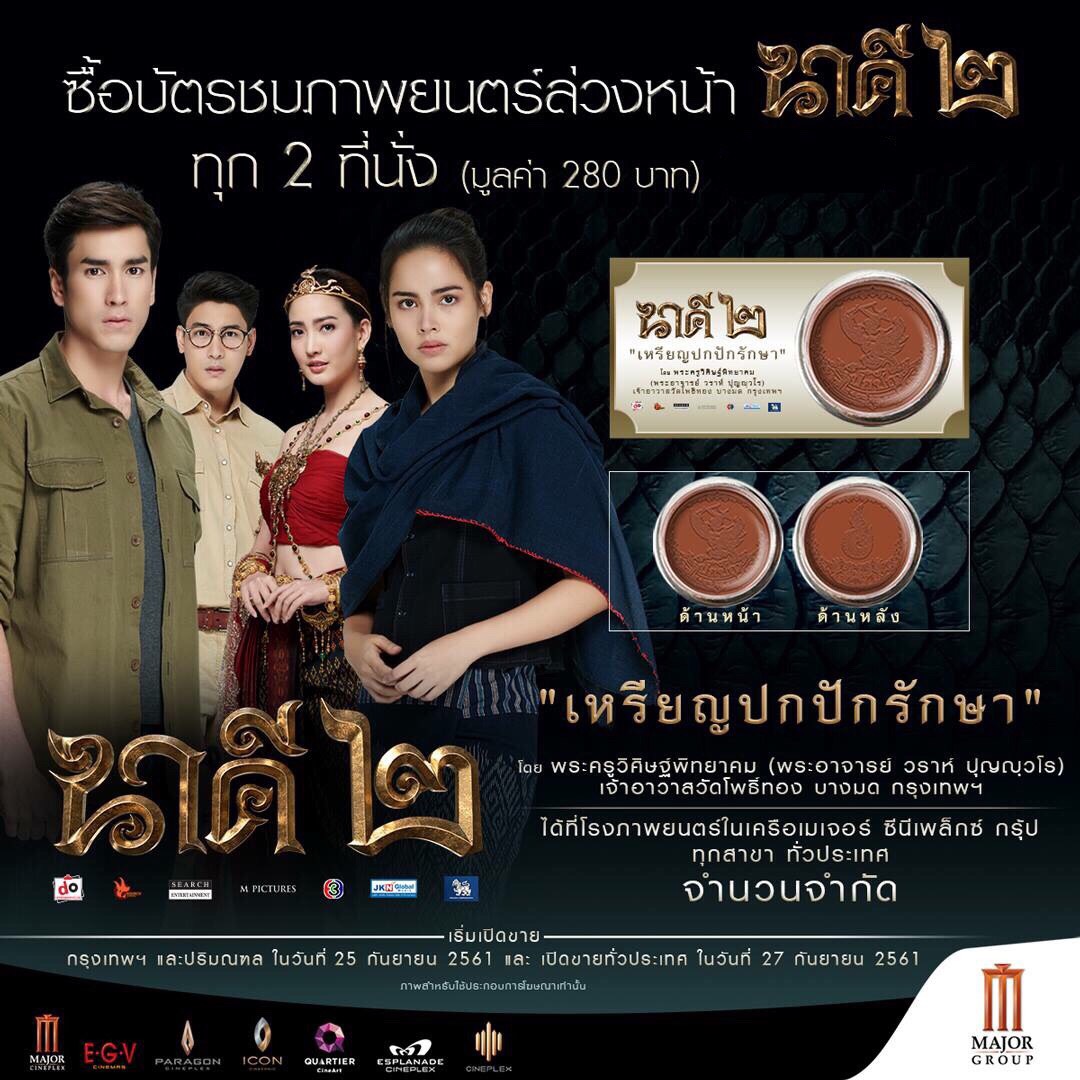 ซื้อบัตรชมภาพยนตร์ล่วงหน้าเรื่อง นาคี 2 ทุก 2 ที่นั่ง รับเหรียญปกปักรักษาราคาชุดละ 280 บาท (1 ชุดประกอบด้วย บัตรชมภาพยนตร์ 2 ที่นั่ง + ของพรีเมี่ยม 1 ชิ้น)