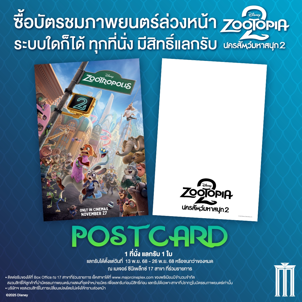 ซื้อบัตรชมภาพยนตร์ล่วงหน้าเรื่อง “Zootopia 2” รับ Postcard ฟรี !