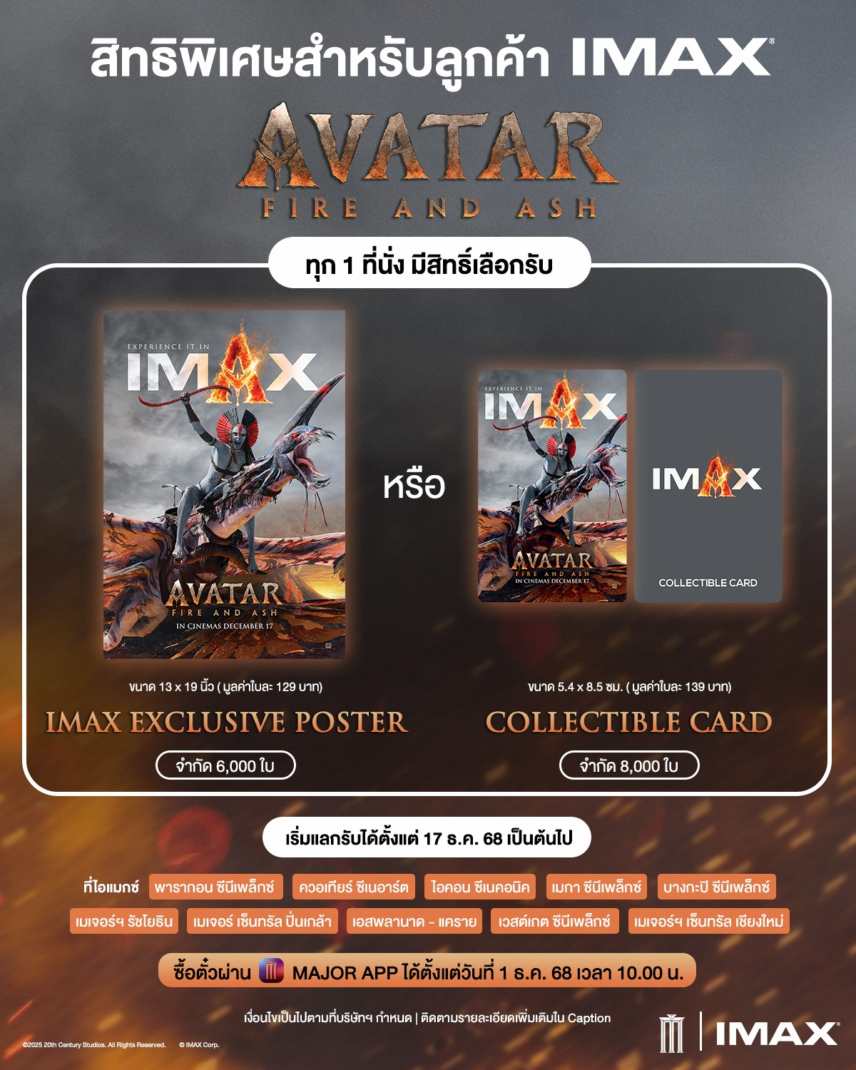 ซื้อบัตรชมภาพยนตร์เรื่อง "Avatar: Fire and Ash" ระบบ IMAX รับ Exclusive Poster หรือ Collectible card ฟรี !