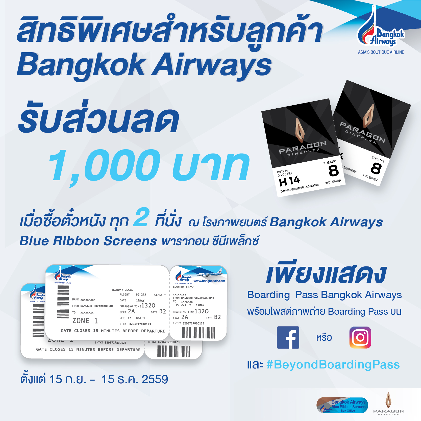 เพียงนำ Boarding Pass ของสายการบิน Bangkok Airways ปี 2559 มารับส่วนลด 50% เมื่อซื้อบัตรชมภาพยนตร์ 2 ที่นั่ง (1คู่) เหลือเพียง 1,000 บาท (จากปกติ 2,000 บาท) ที่โรงภาพยนตร์บางกอก แอร์เวย์สบลูริบบอน สกรีน พารากอน ซีนีเพล็กซ์