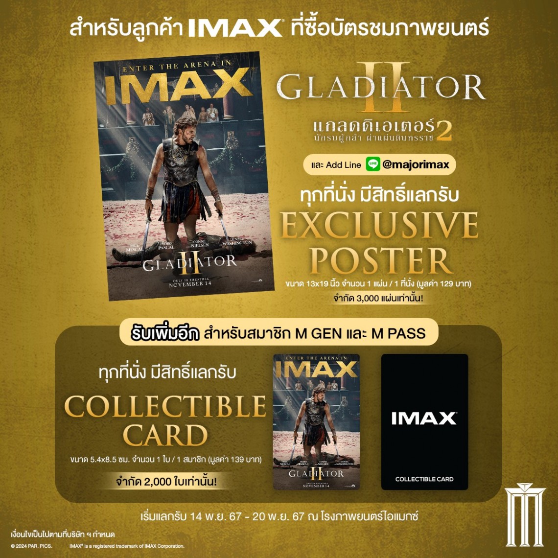 โปรโมชันรวมของสะสม IMAX สำหรับตั๋วหนังเรื่อง “Gladiator II” ตั้งแต่วันที่ 14 พ.ย. 67 - 20 พ.ย. 67