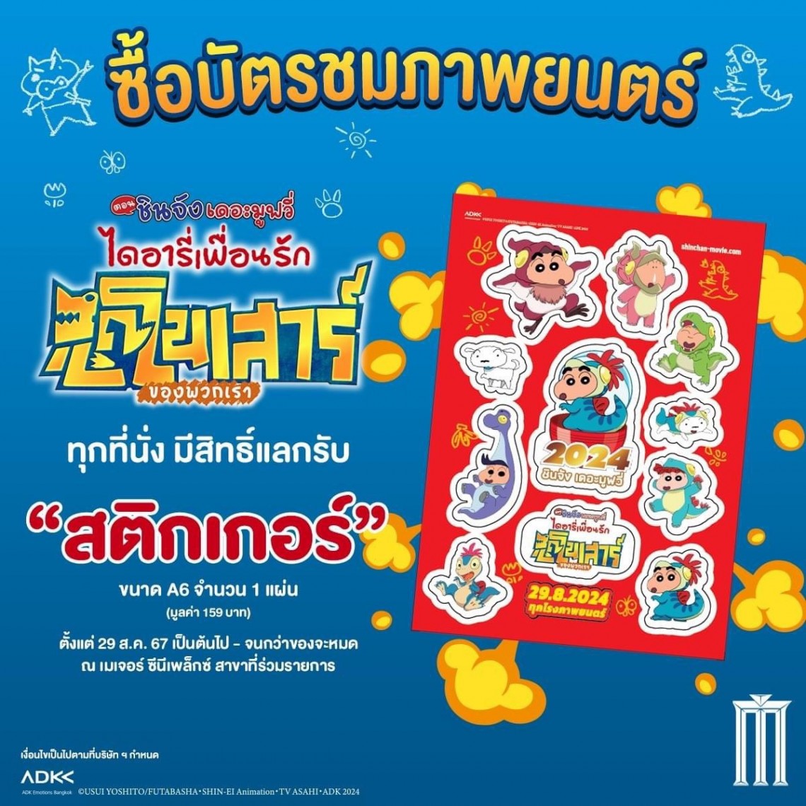 • ซื้อบัตรชมภาพยนตร์เรื่อง “ชินจัง เดอะมูฟวี่ ไดอารี่เพื่อนรัก ไดโนเสาร์ของพวกเรา" ทุกที่นั่ง แลกรับ Sticker ลิขสิทธิ์แท้จากภาพยนตร์ 1 ใบ