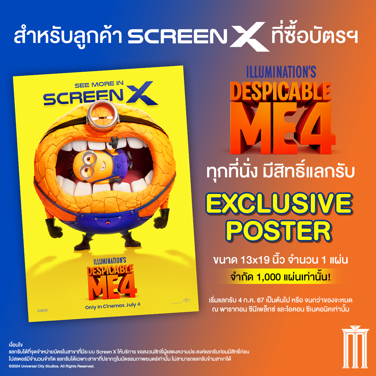• ซื้อตั๋วชมภาพยนตร์ “Despicable Me 4” เฉพาะระบบ Screen X ทุก 1 ที่นั่ง สามารถแลกรับ Screen X Exclusive Poster ได้ฟรี จำนวน 1 แผ่น