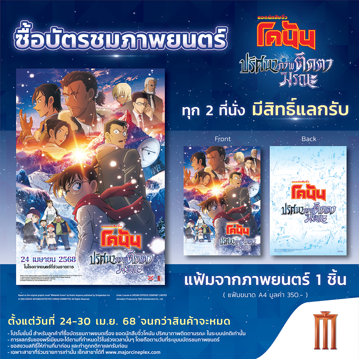 ซื้อบัตรชมภาพยนตร์เรื่อง ยอดนักสืบจิ๋วโคนัน ปริศนาภาพติดตามรณะ ทุก 2 ที่นั่ง รับฟรี แฟ้มจากภาพยนตร์ ขนาด A4 จำนวน 1 ชิ้น (มูลค่า 350 บาท)