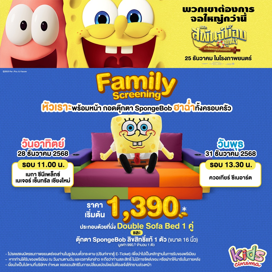 เตรียมพาครอบครัวมาสนุกและสร้างความทรงจำแสนพิเศษ กับรอบ Family Screening เริ่มต้น 1,390.- ภาพยนตร์เรื่อง SpongeBob Movie Search for SquarePants ที่โรงภาพยนตร์ Kids Cinema ประกอบด้วยที่นั่ง Double Sofa bed 1 คู่(สำหรับผู้ใหญ่ 2 ท่าน และเด็กเล็กส่วนสูงไม่เกิน 12 ซม. 1 ท่าน) และรับตุ๊กตา SpongeBob ลิขสิทธิ์แท้ ขนาด 16 นิ้ว มูลค่า 990.- กลับบ้านไปกอดแบบจุใจ เหมาะสำหรับทั้งเด็กและผู้ปกครอง