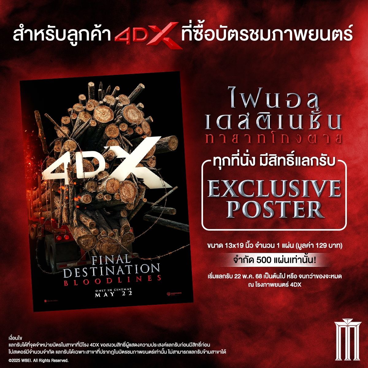 • ซื้อตั๋วชมภาพยนตร์ “Final Destination Bloodlines” เฉพาะระบบ 4DX ทุก 1 ที่นั่ง สามารถแลกรับ 4DX Exclusive Poster ได้ฟรี จำนวน 1 แผ่น