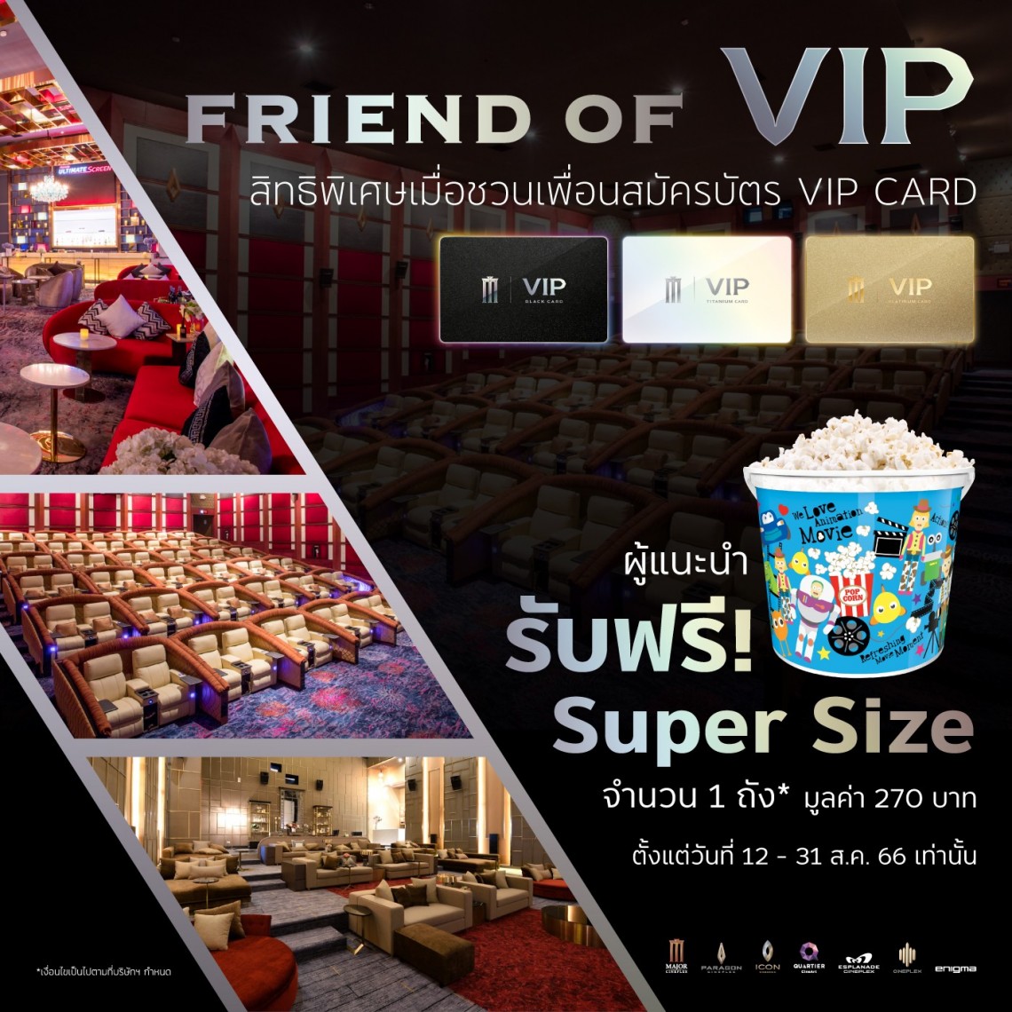 • แนะนำเพื่อนมาซื้อบัตร VIP Card รับฟรี Popcorn Super Size จำนวน 1 ถัง