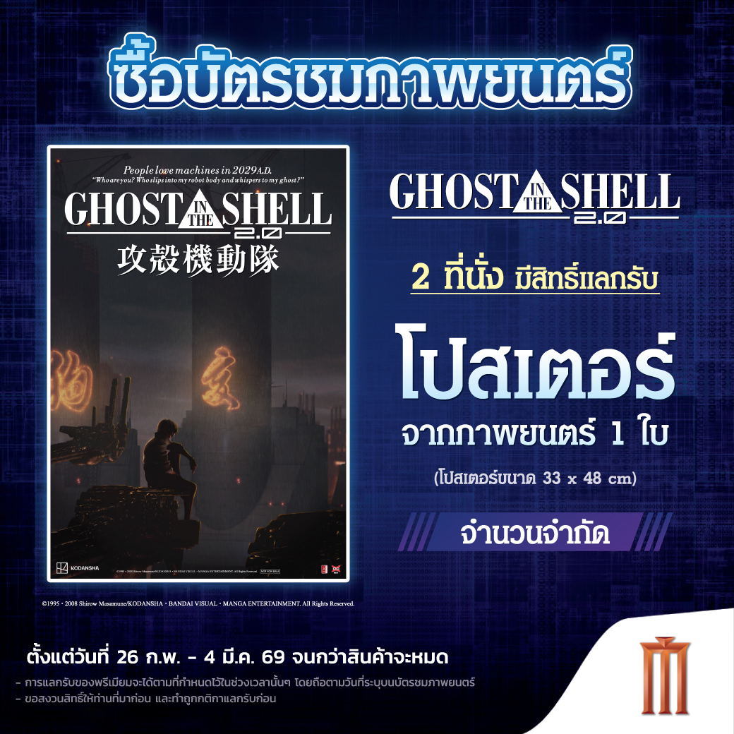 • ซื้อบัตรชมภาพยนตร์ Ghost in The Shell 2.0 (1995) ทุก 2 ที่นั่ง มีสิทธิ์รับ โปสเตอร์จำนวน 1 ใบ (ขนาด 33x48cm)