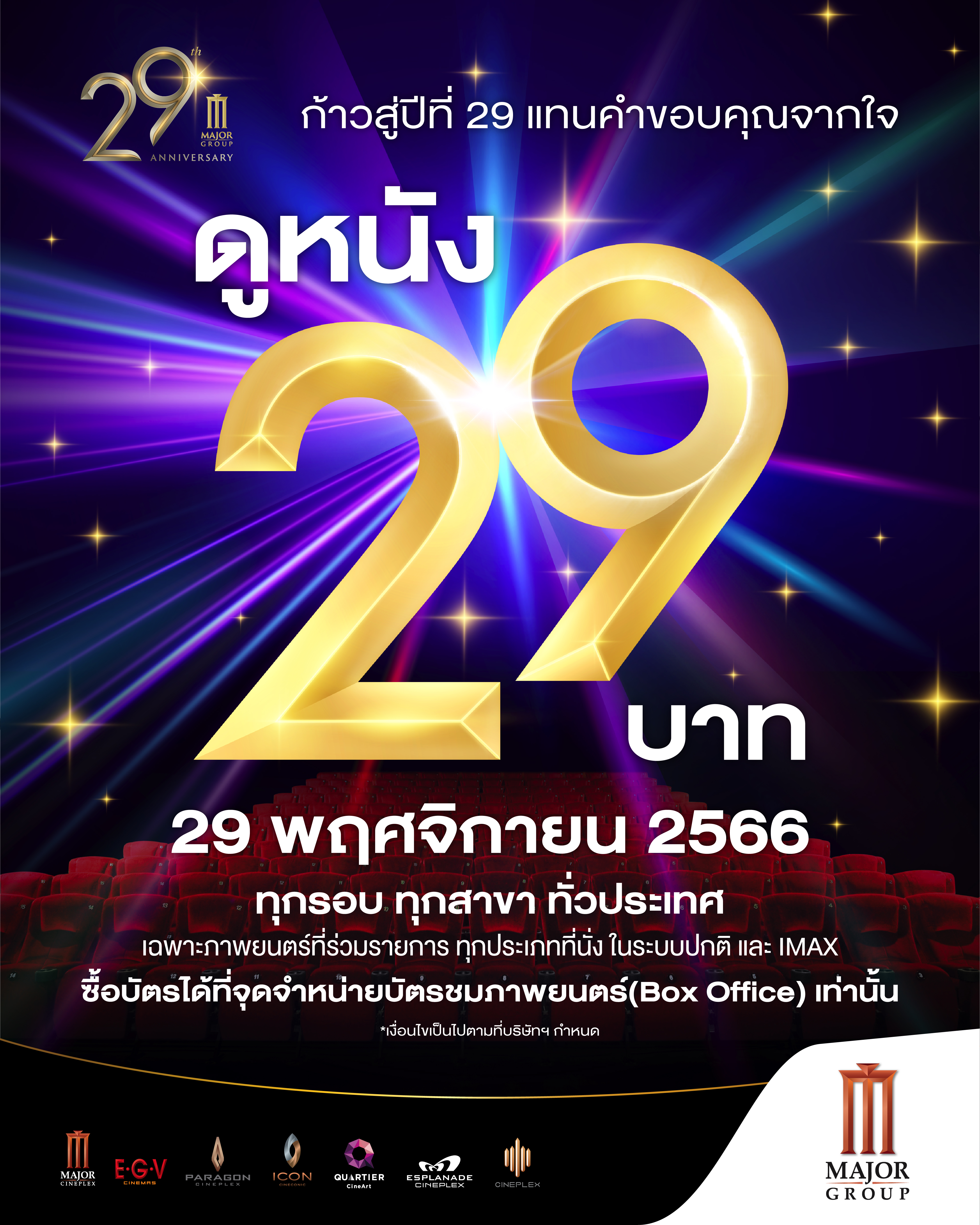 • ชมภาพยนตร์ราคา 29 บาท ทุกรอบ ทุกสาขา สำหรับวันที่ 29 พฤศจิกายน 2566 วันเดียวเท่านั้น (ไม่จำกัดจำนวนสิทธิ์)