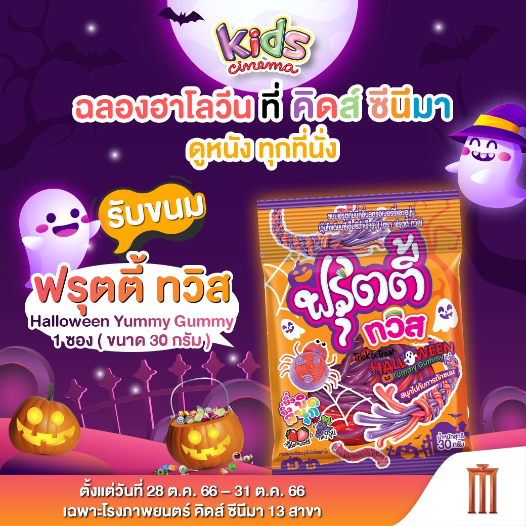 • ดูหนังที่โรงภาพยนตร์ คิดส์ ซีนีมา ทุกที่นั่ง รับขนม ฟรุตตี้ ทวิส Halloween Yummy Gummy 1 ซอง (ขนาด 30 กรัม)