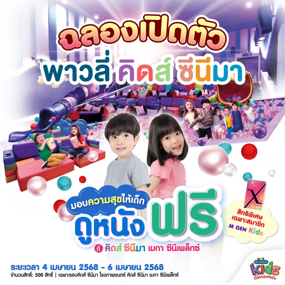 ฉลองเปิดตัว “พาวลี่ คิดส์ ซีนีมา” Pally ถุงเท้าพาวลี่ สร้างสรรค์ถุงเท้าสำหรับทุกคนในครอบครัว ด้วยเส้นใยพรีเมียม ซักเครื่องได้ ไม่ย้วยง่าย เหมาะสำหรับครอบครัว ร่วมกับคิดส์ ซีนีมา พร้อมมอบความสุขให้เด็กๆ ดูหนังฟรี ที่คิดส์ ซีนีมา สาขาเมกา ซีนีเพล็กซ์ สิทธิประโยชน์ดีๆ สำหรับสมาชิก M Gen Kids ต้องห้ามพลาด