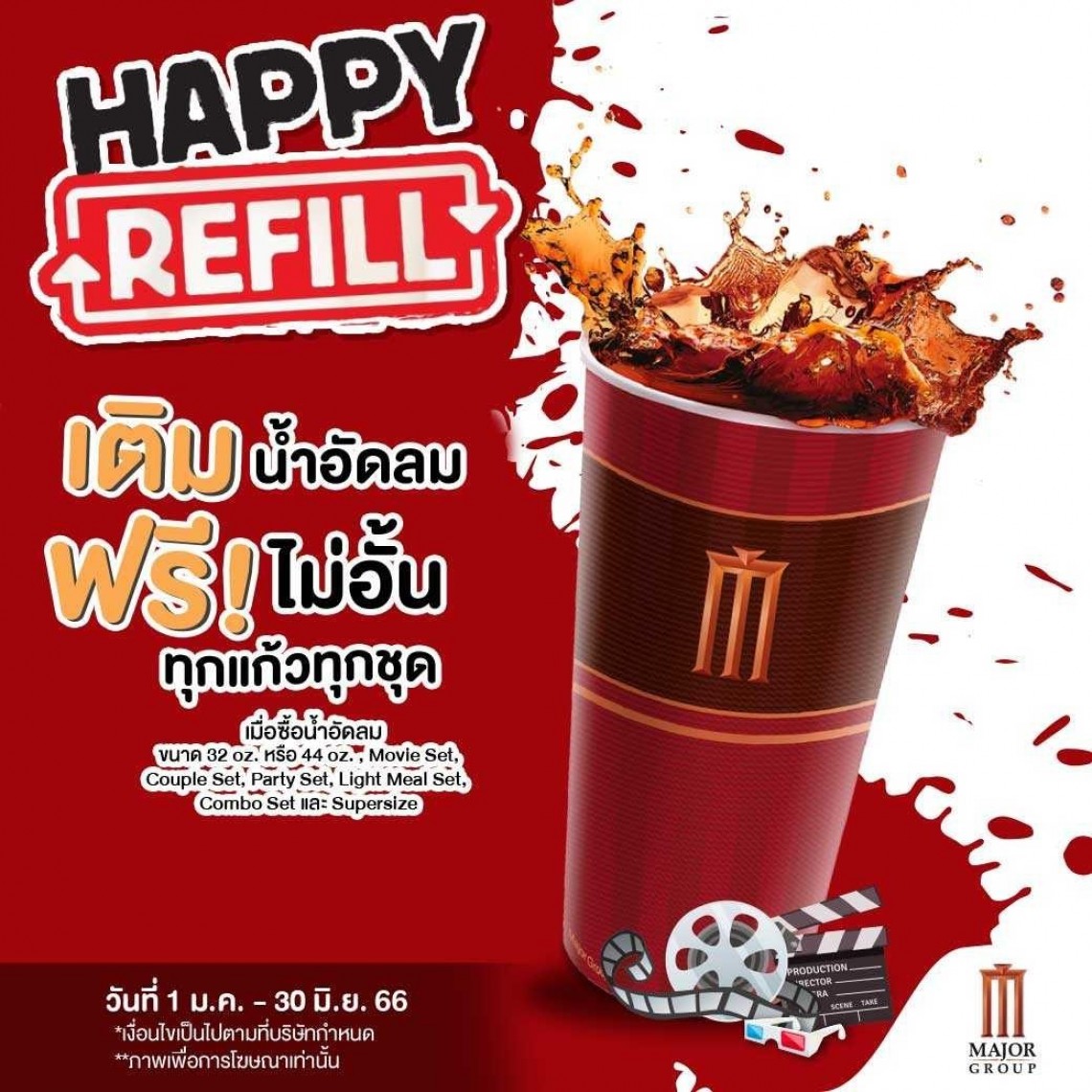 โปรโมชั่น Happy Refill รับสิทธิ์เติมน้ำอัดลมฟรี ไม่อั้น ทุกแก้ว ทุกชุด เพียงซื้อน้ำอัดลมขนาด 32 Oz. , 44 Oz. , Movie Set, Couple Set, Party Set, Light Meal Set, Combo Set, Supersize Set โดยสามารถรับสิทธิ์เติมน้ำอัดลมฟรี เพียงแสดงใบเสร็จที่หน้าเคาท์เตอร์ทุกครั้ง (*จำกัดภายในวันที่ซื้อเท่านั้น)